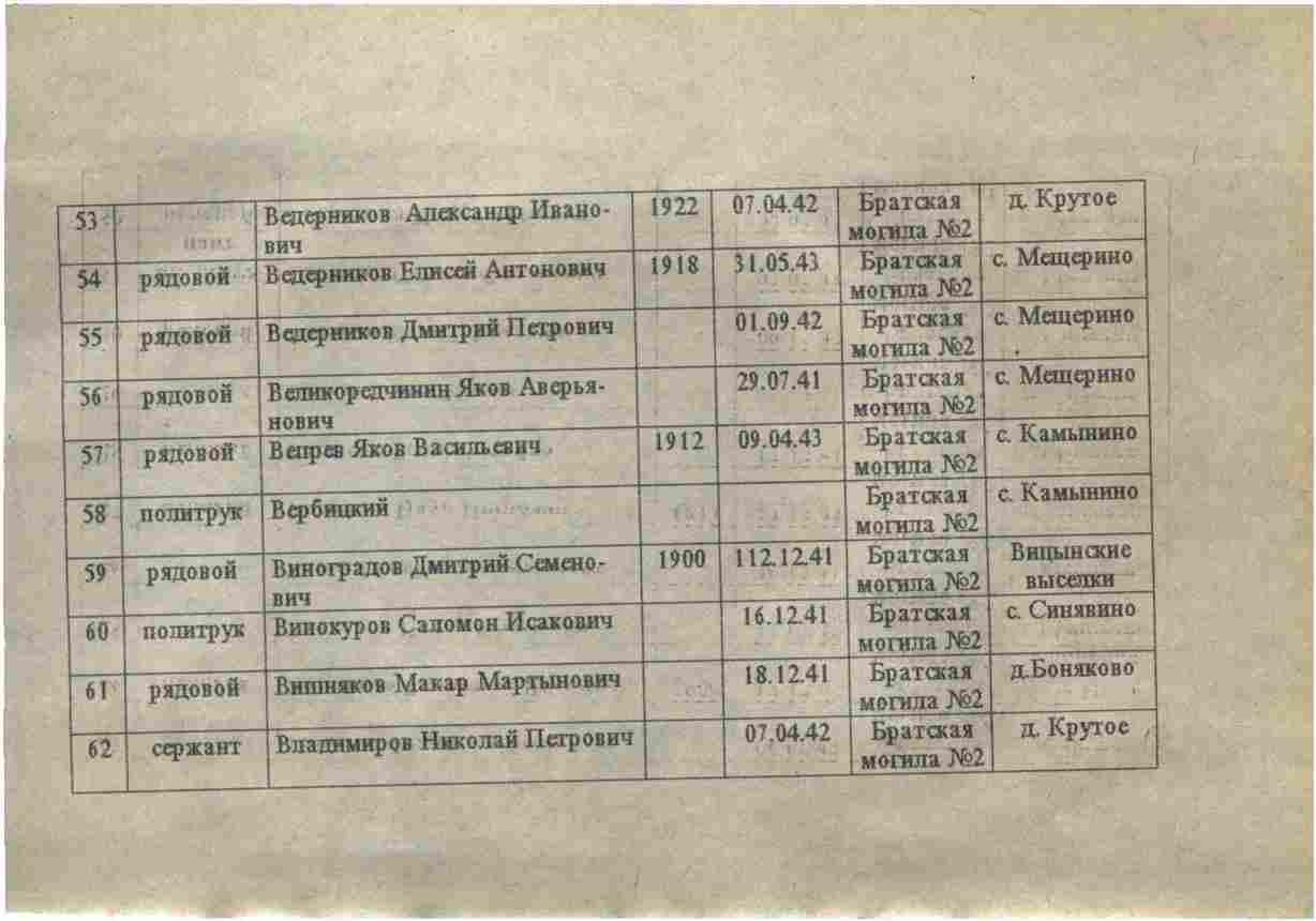 Список погибших в: д.Крутое,с.Мещерино,с.Камынино,Вицынские Выселки,с.Синявино,д.Боняково. Прикрепленные файлы: