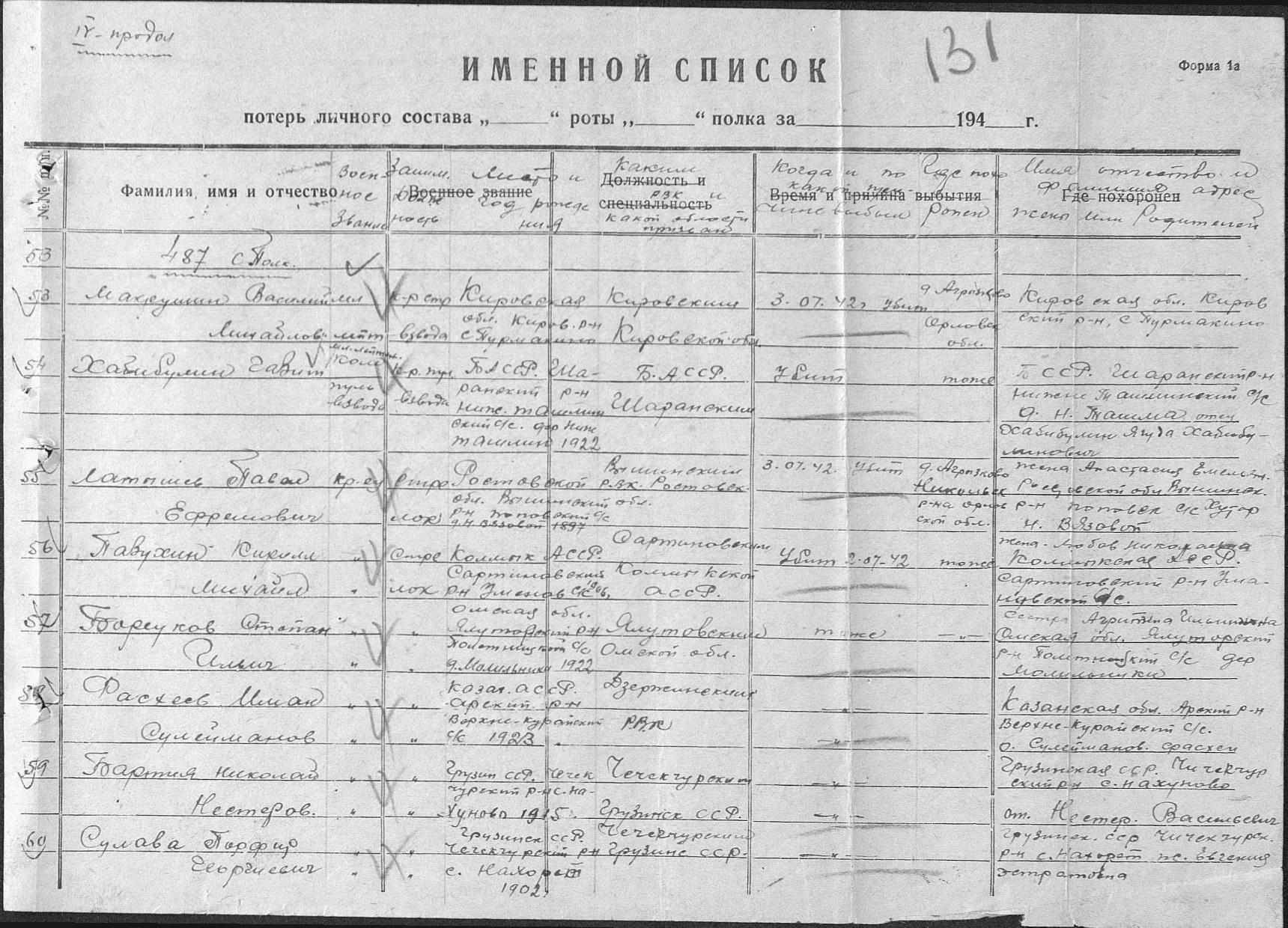 Марина Фандеева: Доброго времени суток, Марина! К сожалению, ваша ситуация - далеко не редкость. Ливенская администрация дала вам такой ответ на основании того, что в именных захоронениях района ваш дед не числится, то есть его нет в учётной карточке ни одной братской могилы. Здравствуйте,мы Вам писали сообщение о нашем дедушке Латышев Павел Ефремович. Нам пришло много ответов за что очень благодарны,но мы тоже вели поиски сами и нашли в ОБД Мемориал две записи. В одной записи пропал без вести в июне 1942 года,а в другой записи убит в июле 1942 года похоронен в деревне Огрызково Орловской области Ливенского района. Мы ездили на место захоронения,делали запросы в Ливенскую администрацию,нам ответили,что в Ливенском районе он не числится.С области никаких данных не дают.Но местные жители нам объяснили,что это место находится на стыке трех областей и документы по его захоронению могли попасть в Курскую или Липецкую области.Не могли бы Вы проверить эту информацию у нас ничего не получается.Большое спасибо. Вместе с вашим дедом в Огрызково погибли и захоронены 28 бойцов. 26, включая вашего деда, ни в одной братской могиле Ливенского района не значатся. Лишь двое увековечены: Информация из донесения о безвозвратных потерях Фамилия Белых Имя Валентин Отчество Семенович Дата рождения/Возраст __.__.1923 Место рождения Орловская обл., Никольский р-н, с. Новестное Дата и место призыва Никольский РВК, Орловская обл., Никольский р-н Последнее место службы 143 сд Воинское звание мл. сержант Причина выбытия убит Дата выбытия 03.07.1942 Название источника информации ЦАМО Номер фонда источника информации 58 Номер описи источника информации 818883 Номер дела источника информации 1004 Захоронен в Огрызково Информация из списков захоронения Фамилия Белых Имя Валентин Отчество Семенович Дата рождения/Возраст __.__.1923 Воинское звание рядовой Дата смерти 03.07.1942 Страна захоронения Россия Регион захоронения Орловская обл. Место захоронения Ливенский р-н, с. Норовка Могила Братская могила № 42 Информация из донесения о безвозвратных потерях Фамилия Плакса Имя Степан Отчество Васильевич Дата рождения/Возраст __.__.1906 Место рождения Каменец-Подольская обл., Полонинский р-н, с. Мондан Вальяна Дата и место призыва Полонский РВК, Украинская ССР, Каменец-Подольская обл., Полонский р-н Последнее место службы 143 сд Воинское звание красноармеец Причина выбытия убит Дата выбытия 02.07.1942 Название источника информации ЦАМО Номер фонда источника информации 58 Номер описи источника информации 818883 Номер дела источника информации 1004 Захоронен в д. Огрызково Информация из списков захоронения Фамилия Плакса Имя Степан Отчество Васильевич Воинское звание рядовой Дата смерти 03.07.1942 Страна захоронения Россия Регион захоронения Орловская обл. Место захоронения Ливенский р-н, с. Норовка Могила Братская могила № 42 У нескольких бойцов упомянуто место захоронения в Книгах памяти: Информация из Книги Памяти Фамилия МАКРУШИН Имя Василий Отчество Михайлович Дата рождения/Возраст __.__.1922 Дата выбытия 03.07.1942 Название источника информации Книга памяти. Кировская область. Том 4 Захоронен д. Огрызково Орловской области Информация из Книги Памяти Фамилия ФАСХЕЕВ Имя Иман Отчество Сулейманович Дата рождения/Возраст __.__.1923 Дата выбытия 02.07.1942 Название источника информации Книга памяти. Калужская область. То