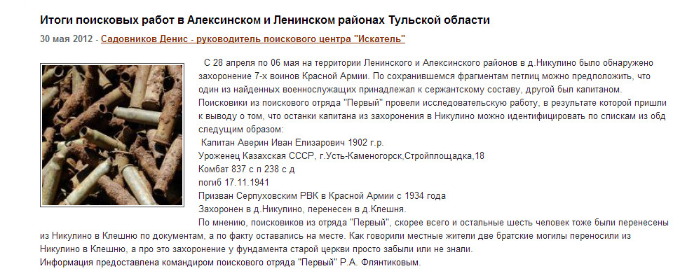 Итак. Коллеги можно подводить итоги. В 2012 году в деревне Никулино обнаружены и погребены останки семи советских воинов. Установить якобы удалось имя капитана Аверина Ивана Елизаровича. Прикрепленные файлы: