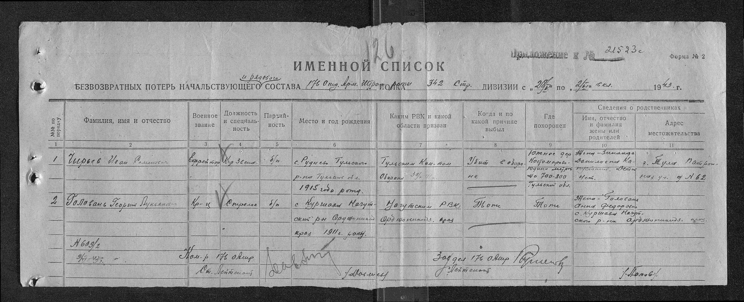 Добрый день дорогие поисковики!! Огромное спасибо за Ваш нелегкий труд! Помогите пожалуйста подтвердить место захоронения моего деда: Головань Георгий Лукьянович уроженец Ставропольского края с.Куршава, призван в 1941 Нагутским РВК.Погиб и захоронен в июне 1943 в Полтево Чернского р-на Тульской области. Очень хочется приехать к нему на могилу и поклониться всем павшим солдатам.Заранее благодарю!!! Администратор сайта | ||||