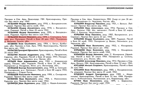 Основания такие. Воскресенский район - место откуда был призван дед, назывался в то время Ворошиловским. Вот и получается, что было два Кузьмина Филиппа Ивановича призванных из одного района, воевавших в одной дивизии, скончсавшихся или погибших в один день. А если брать еще и третью дату - 1898 год, то их вообще три получается. Ну и...видимо все это дед. Вопрос в том, где похоронен. С уважением, Валерий Попов | ||||||||||||