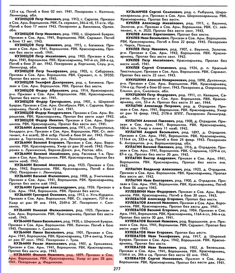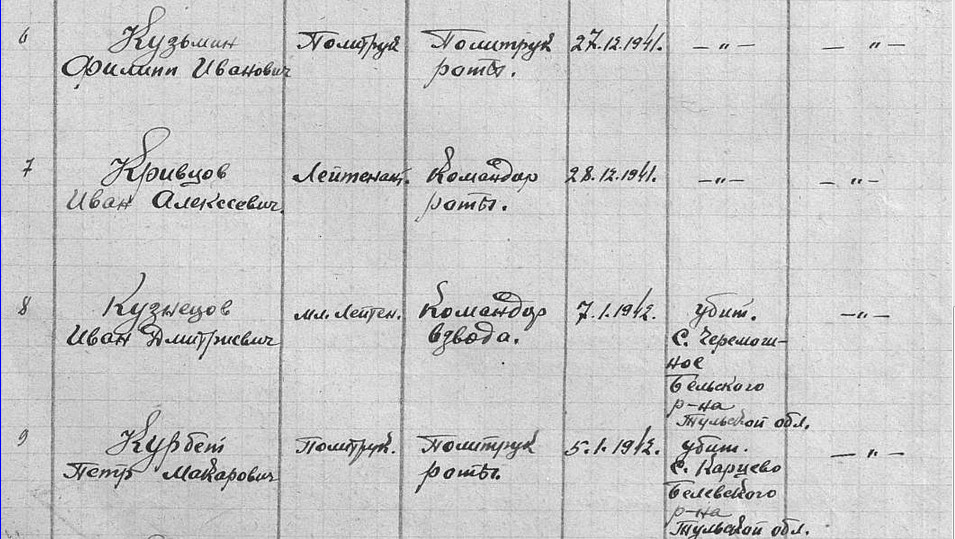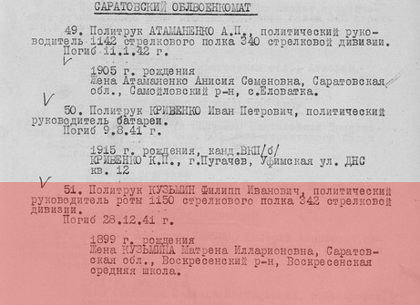 Валерий. 1.Понятно, что это один и тот же Кузьмин из Саратовской области. 2. Вы нашли донесение о безвозвратных потерях, в котором указано место захоронения Кузьмина Велична? 3. Первичный документ- донесение о безвозвратных потерях. Именные захоронения, книги памяти появились позже. Еще раз привожу первый документ с указанием места захоронения. В этом документе фамилия Кузьмин без мягкого знака: Информация из донесения о безвозвратных потерях Фамилия Кузмин Имя Филипп Отчество Иванович Дата рождения/Возраст __.__.1899 Место рождения Саратовская обл., Татищевский р-н, с. Слепцино Дата и место призыва Воскресенский РВК, Саратовская обл., Воскресенский р-н Последнее место службы 61 Арм. 342 СД 1150 СП Воинское звание политрук Место захоронения с. Фединское Причина выбытия убит Дата выбытия 28.12.1941 Название источника информации ЦАМО Номер фонда источника информации 58 Номер описи источника информации 818883 Номер дела источника информации 1078 В списке 13 человек командного состава 1150 СП Советую, пробейте каждого по ОБД Мемориал Донесения о безвозвратных потерях Номер донесения 4739 Тип донесения Донесения о безвозвратных потерях Дата донесения 09.04.1942 Название части ОК 61 Арм. 4. Объясните, на основании, какого документа якобы была похоронка, что Кузьмин убит и похоронен в д. Велична? 5. И с ваших слов - «А так это моя родная бабушка, которая его ждала до конца своей жизни». Почему она ждала, если по вашим словам якобы была похоронка с указанием места захоронения Велична. 6. Ваша информация о друге -«После войны в нашу семью пришло письмо его сослуживца. ОН рассказывал, что погиб и захоронен дед в Фединском» вполне возможно объясняет, почему сначала он был записан в именное захоронение Велична!!!! 7. По чьей просьбе был внесен Кузьмин в именные списки захоронения Велична в 1953 году? 8. Из электронной Книги Памяти Тульской области - КУЗЬМИН Филипп Иванович, pод.: 1918 г., политрук, 1150 СП 342 СД, 28 декабpя 1941 г. погиб и зах.: Тульская обл., Белевский р-н, д. Фединское. Но его нет в печатной книге (1918 г.р.). Почему??? 9. С какой целью записали Кузьмину в именном захоронении д. Фединское год рождения 1918? 10. - КУЗЬМИН Филипп Иванович, pод.: 1988 г., политрук, в списке именного захоронения д. Велична. Но его НЕТ в Книге Памяти Тульской области!!!!! Ни в печатной, ни в электронной. 11. История с Вашим дедом аналогична истории – Аверин Иван Елизарович. Поэтому я и просил Вас почитать расследование о нем. 12. Такие случаи не единичные. С уважением, ВИК | ||||||||||||