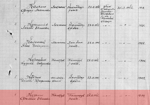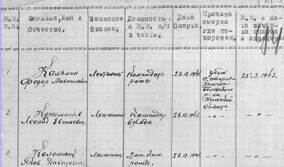 Ну...этого я не могу знать. Может я что ни так делаю,но ...поймите... Сейчас я просто ищу данные на Мемориале и не знаю, почему допустим Кудрин не указан. Поймите я не был военкомом Белёвского района или кем там, кто составлял эти списки. Причем ситуация такая. Командный состав этого полка похоронен как я понимаю, как в Фединском , так и в Величне. Я не знаю, был ли дед по службе ближе к Кудрину , или допустим Яппарову или еще кому то . Кстати по Кудрину. В Величне он есть . Просто я снимок так сделал. Там снята шапка и захорененные люди с первого человека по третьего, а потом с шестого по девятый. Весь лист на компьютере не вышло снять. Правда можно и весь, но тогда видно плохо. Мой дед шестой. Четвертый и пятый захороненные люди просто пропушены ( это я их не снял ). Высылаю вам файл, где и Кудрин и дед. Все есть. Правда тут я уже шапку не снял, но это один лист, который в клеточку с предыдущими. Просто он снят с разных позиций. Кудрин пятый, а дед шестой. Прикрепленные файлы: