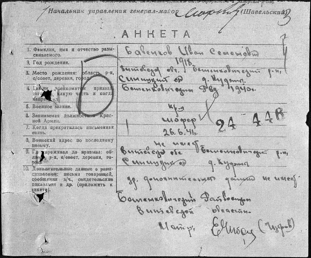 Коллеги, вот он наш Иван Семенович!!! Правда недалеко мы ушли, но всё же хоть что-то!!!: Фамилия Бавенков Имя Иван Отчество Семенович Место рождения Белорусская ССР, Витебская обл., Бешенковичский р-н Дата и место призыва __.__.1940 Бешенковичский РВК, Белорусская ССР, Витебская обл., Бешенковичский р-н Воинское звание красноармеец Причина выбытия пропал без вести Дата выбытия __.07.1941 Название источника информации ЦАМО Номер фонда источника информации 58 Номер описи источника информации 18004 Номер дела источника информации 1208 Прикрепленные файлы: