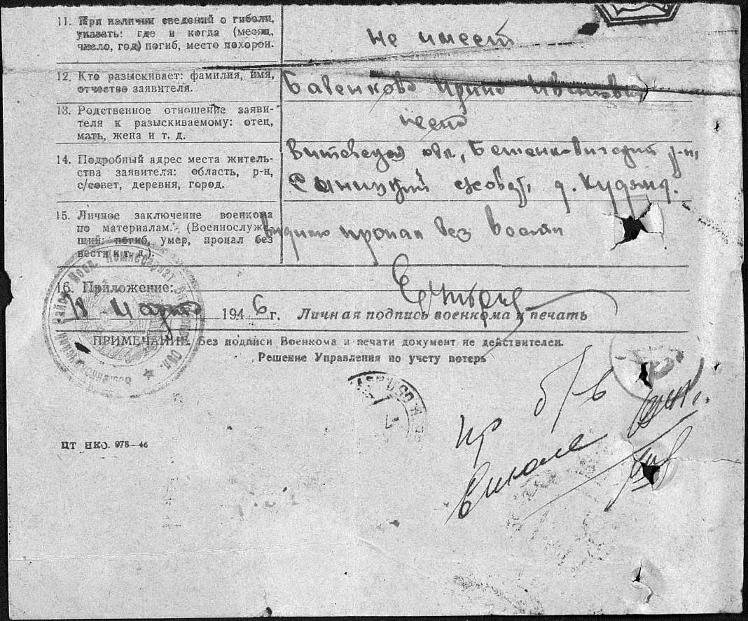 Написано, что информация из Списка по месту рождения. И там сказано, что Бабенков Иван Семенович (год рождения 1918...Июль 41-го. Красноармеец. Проживал в Витебской области, деревня Кудяны. Пропал без вести. Редактировалось: 3 раз (Последний: 31 января 2014 в 17:18) С уважением, Валерий Попов | ||||||||||