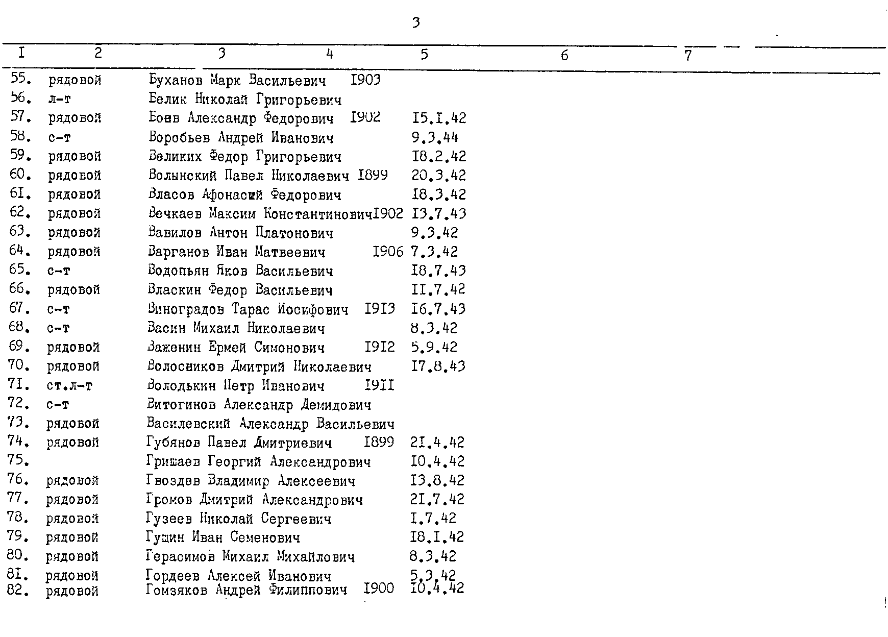 Вотинцева Татьяна: Коллеги, вот ещё один пример: Фамилия Буханов Имя Марк Отчество Васильевич Дата рождения/Возраст __.__.1903 Место рождения Воронежская обл., Райзовский р-н, с. Н.-Солдатское Дата и место призыва Репьевский РВК, Воронежская обл., Репьевский р-н Последнее место службы 387 сд Воинское звание красноармеец Причина выбытия убит Дата выбытия 07.03.1942 Название источника информации ЦАМО Номер фонда источника информации 58 Номер описи источника информации 818883 Номер дела источника информации 1182 Прикрепленные файлы: