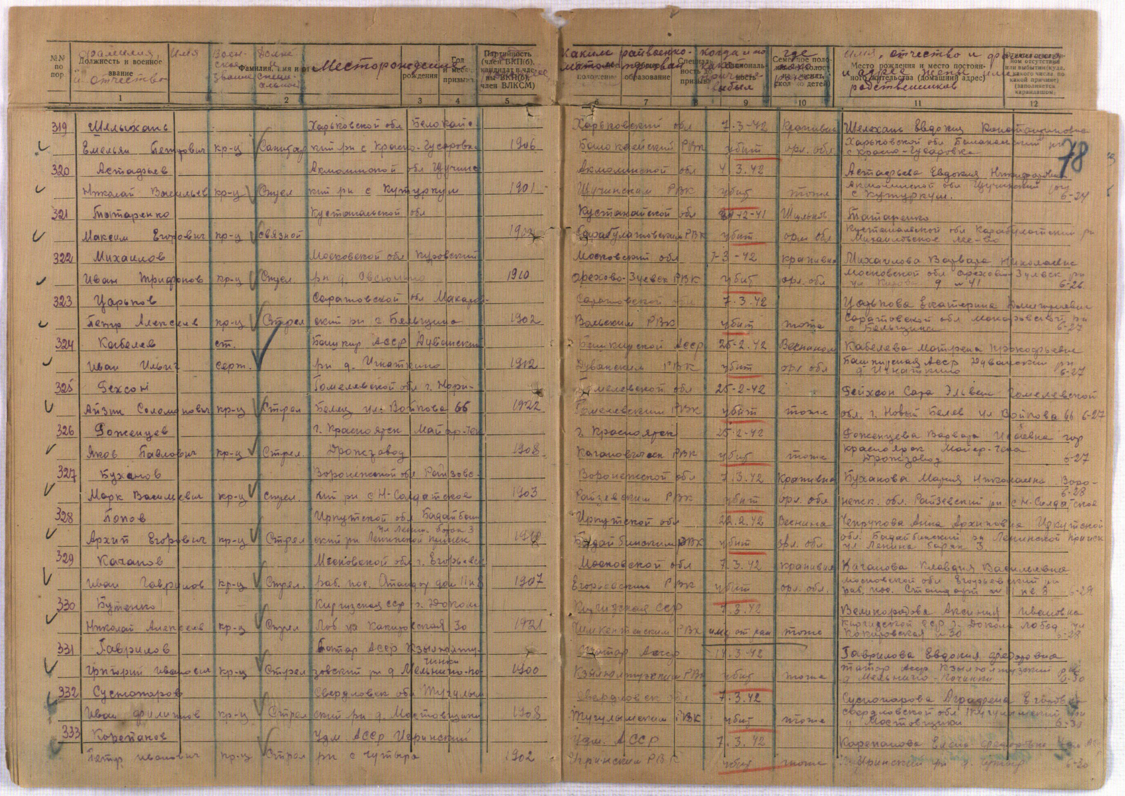 Коллеги, вот ещё один пример: Фамилия Буханов Имя Марк Отчество Васильевич Дата рождения/Возраст __.__.1903 Место рождения Воронежская обл., Райзовский р-н, с. Н.-Солдатское Дата и место призыва Репьевский РВК, Воронежская обл., Репьевский р-н Последнее место службы 387 сд Воинское звание красноармеец Причина выбытия убит Дата выбытия 07.03.1942 Название источника информации ЦАМО Номер фонда источника информации 58 Номер описи источника информации 818883 Номер дела источника информации 1182 Прикрепленные файлы: