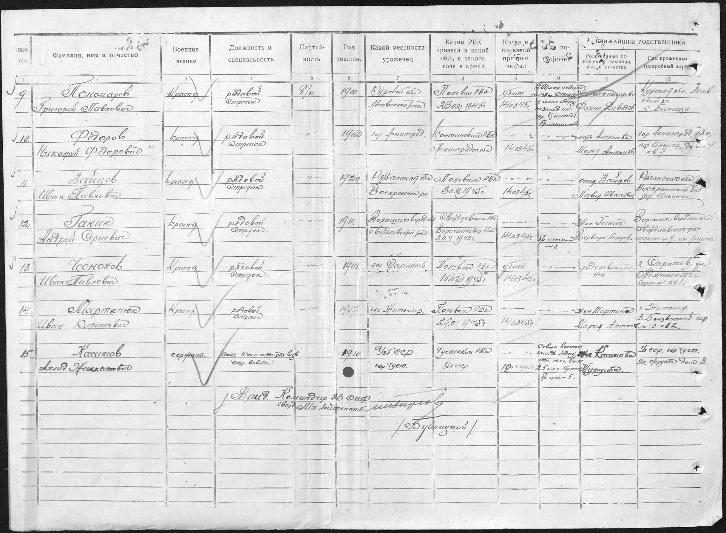 Выше прикреплённая страница - из донесения об освобождённых из плена. Номер донесения 47112 Тип донесения Донесения об освобожденных из плена Дата донесения 11.04.1945 Название части Упр. 2 Гв. Арм. Ашанин Егор Кондратьевич - один из тех, кто включен в именной список бывших военнослужащих сержантского состава, прошедших проверку в окр. "СМЕРШ" 2 Гв. армии при сборном пересыльном пункте № 47 и направленных в 9 арм. запасной стрелковый полк. С пункта Ашанин выбыл 3 1945 года в 9 армейский запасной стрелковый полк 2 гв. армии. Редактировалось: 1 раз (Последний: 19 января 2014 в 16:56) | ||||