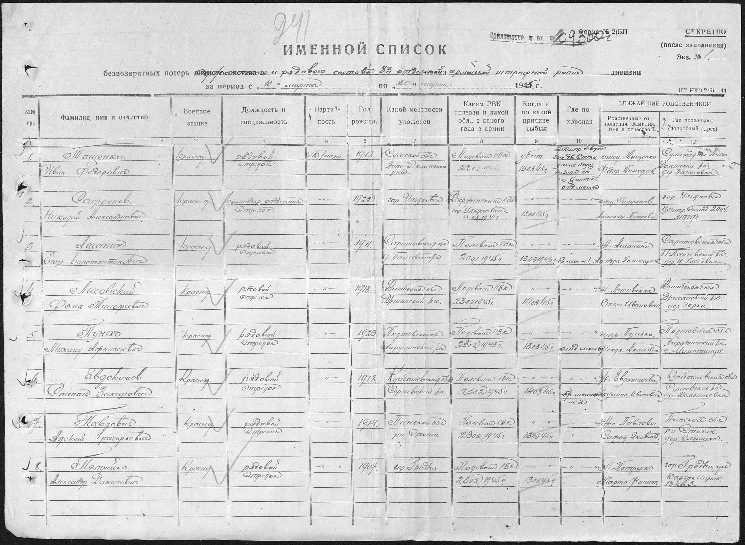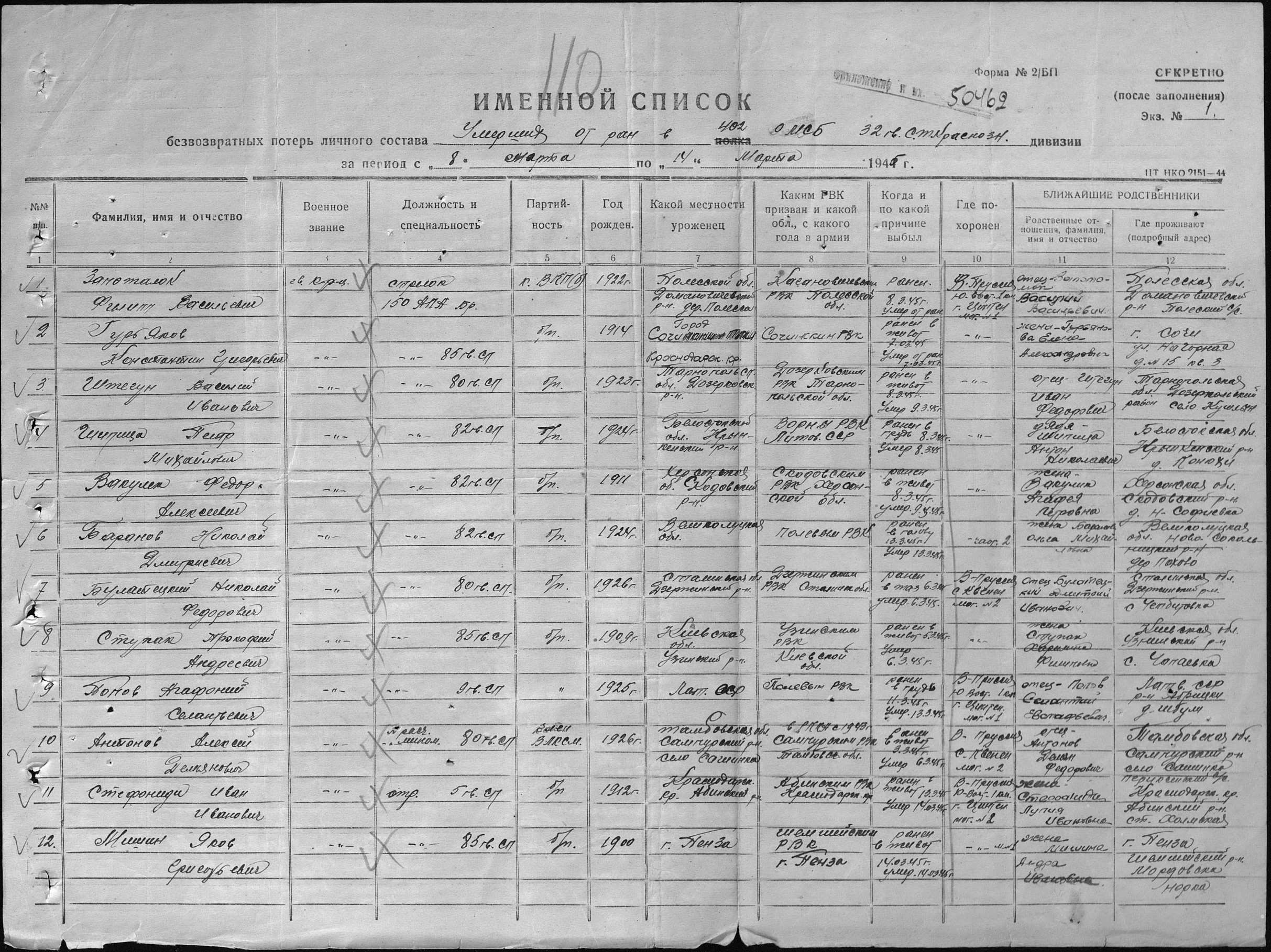 Из тех, кто примерно в одно время с Ашаниным выбыл из пересыльного пункта, удалось пока проследить судьбу одного человека: Информация из донесения о безвозвратных потерях Фамилия Мартынюк Имя Иван Отчество Кириллович Дата рождения/Возраст __.__.1907 Место рождения г. Житомир Дата и место призыва 29.01.1945, полевой ВК Последнее место службы 32 Гв. сд Воинское звание красноармеец Причина выбытия убит Дата выбытия 14.03.1945 Название источника информации ЦАМО Номер фонда источника информации 58 Номер описи источника информации 18003 Номер дела источника информации 363 Прикрепленные файлы: