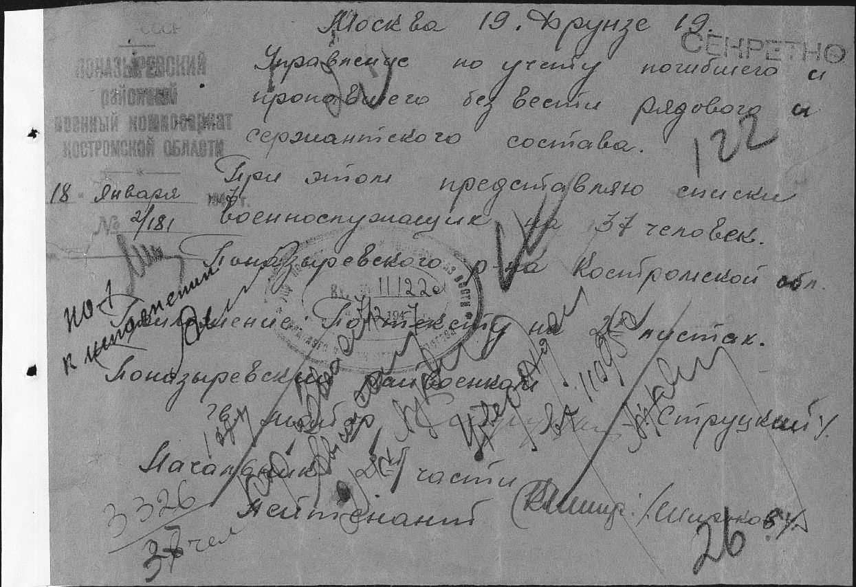 Татьяна. Вы на правильном направлении . Из общения с заявителем я знаю, что там было много призывников из Горького. Заявитель даже обращался ы военкомат этой области, но так как район уже был передан в Костромскую, то и запрос переадресовали туда. С уважением, Валерий Попов | ||||||||||||||