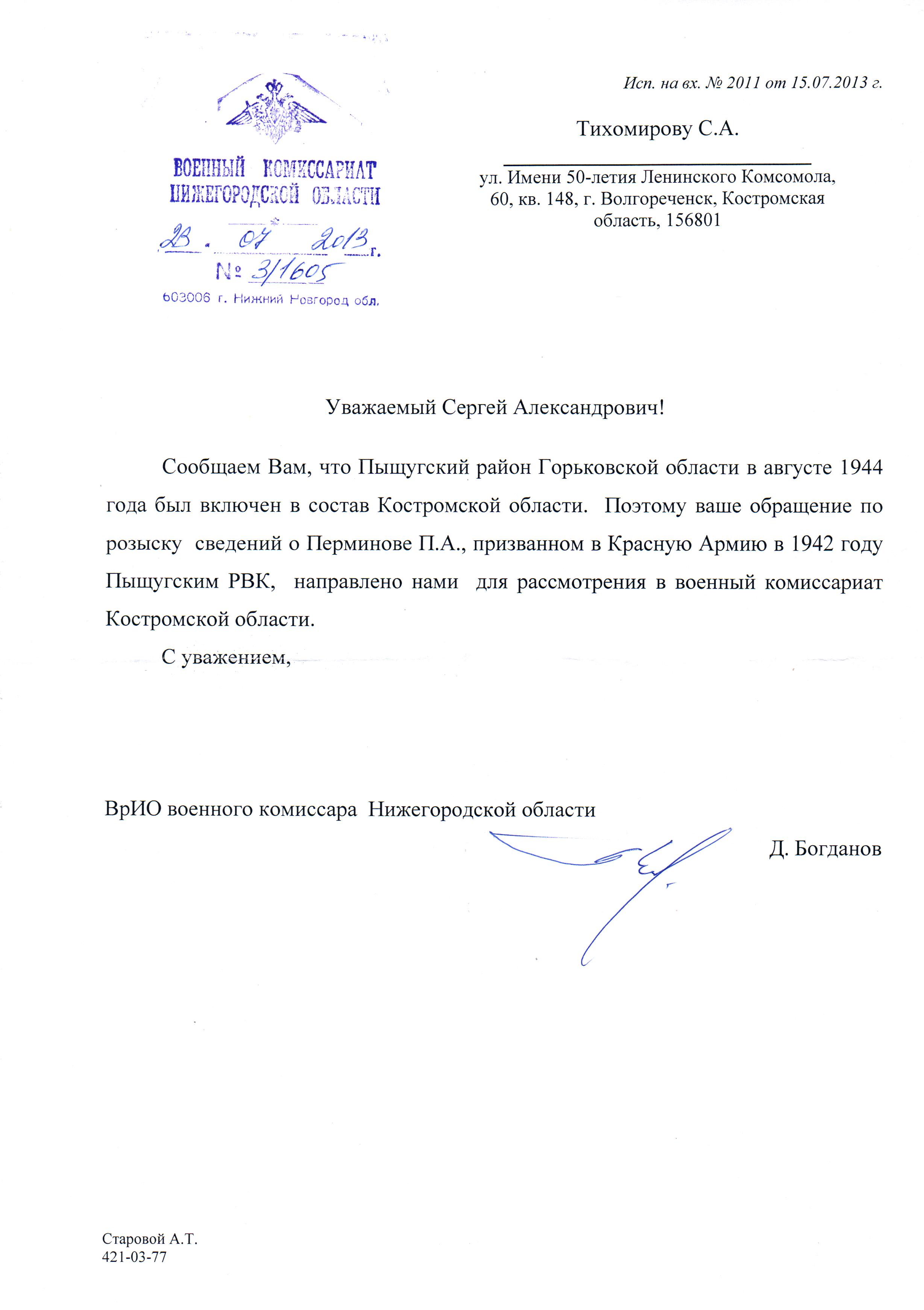 Здравствуйте, Татьяна! Пишет вам Тихомирова Наталья из Костромской области, которая разыскивает сведения о дедушке Перминове Петре Аникеевиче, который пропал без вести в 1943 году. Запрос в ЦАМО мы отправили через наш местный военкомат, прошло уже 3 недели. Ждем ответа, пока ничего нет. Но это наверное и не так быстро будет. Как только нам пришлют ответ, я сразу же копию вам отправлю, чтобы вы сами все проверили что дальше нам надо будет делать. Спасибо за участие в наше судьбе, судьбе нашего деда. До свидания. С уважением, наталья. |