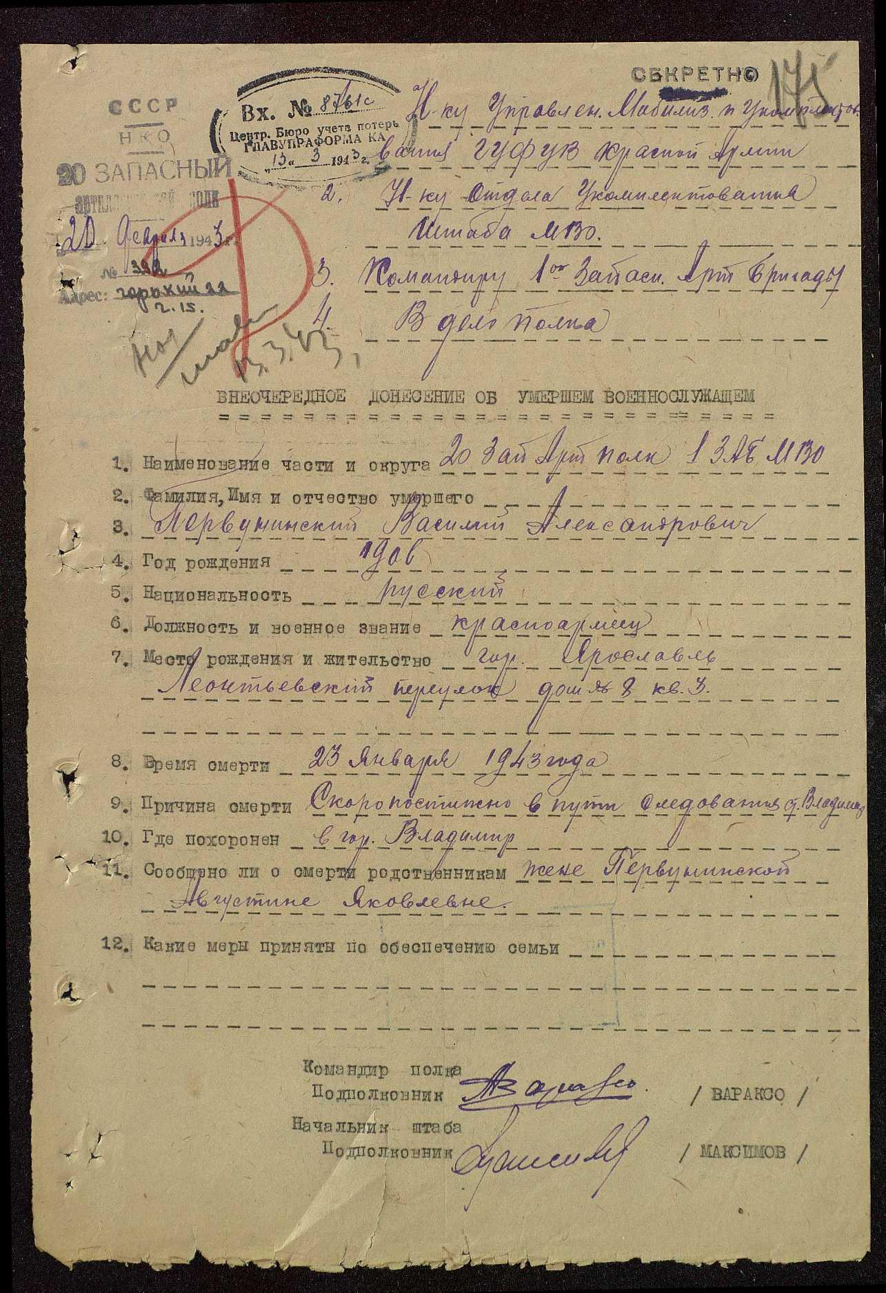 Дорогие коллеги, в инете нашла ссылки на несколько документов из ЦАМО по 20- му запасному артиллерийскому полку 13 АБ МВО (Московский военный округ). Донесение об умершем военнослужащем от 2- февраля 1943 года. На штампе адрес: город Горький 22. Прикрепленные файлы: