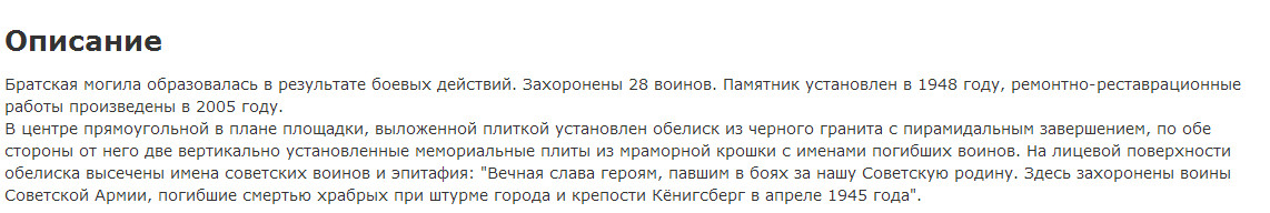 Вот на этом сайте есть Братские могилы Калининграда и области. Смотрел пока немного. Есть могила на улице Герцена, Павлючкова там нет. Есть на улице Куйбышева. Тоже нет. www.prussia39.ru С уважением, Валерий Попов | ||||