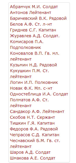 Вот сообщение от поисковика из Калининграда: Мы в 2007 бойца подняли тоже было написано фамилия в Парке Победы, приезжает родня, а там ни его ни других фамилий простых солдат нет. | ||||
