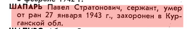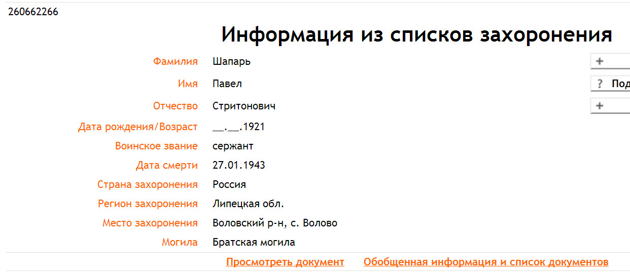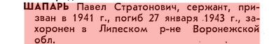 Думаю, Шапарь должен быть увековечен вот здесь: Информация о захоронении Страна захоронения Россия Регион захоронения Липецкая обл. Номер захоронения в ВМЦ 48-5 Место захоронения Воловский р-н, с. Волово Вид захоронения братская могила Количество могил 1 Захоронено всего 168 Захоронено известных 168 Захоронено неизвестных 0 Кто шефствует над захоронением Воловская средняя школа Воловского р-на Липецкой обл. Собственно, он там и увековечен, но отчество исказили:должен быть Старотапович, а записали Стритонович Редактировалось: 1 раз (Последний: 20 марта 2014 в 17:45) | ||||