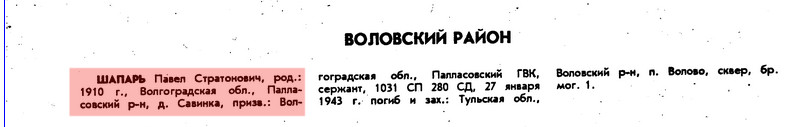Валерий Попов: Тульскую версию подтверждает плита из Волово. Там Шапарь предпоследний. Видимо, банальное совпадение названий. Хотя, можно проверить по боевому пути 280 сд. | ||||