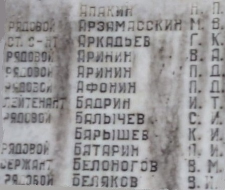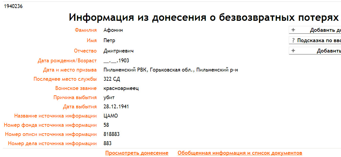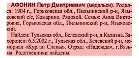 А вот три записи из электронной Книги памяти Тульской области: АФОНИН Петр Дмитриевич, pод.: 1906 г., кр-армеец, 1089 СП 322 СД, 27 декабpя 1941 г. погиб и зах.: Тульская обл., Белевский р-н, c. Темрянь, перезах.: д. Велична. АФОНИН Петр Дмитриевич, род.: 1903 г., Горьковская обл., Пильнинский р-н, Языковский с/с, с. Языково, рядовой, погиб в 1943 г., останки найдены в октябре 2001 г. у д. Кализна Белевского р-на Тульской обл., 6 мая 2002 г. и зах.: Тульская обл., Белевский р-н, Курган Бессмертия, мог. 44. АФОНИН Петр Дмитриевич, род.: 1903 г., Калининская обл., Пильненский р-н, в 1942 г. погиб и зах.: Тульская обл., Белевский р-н, Курган Бессмертия, м-44. | ||||