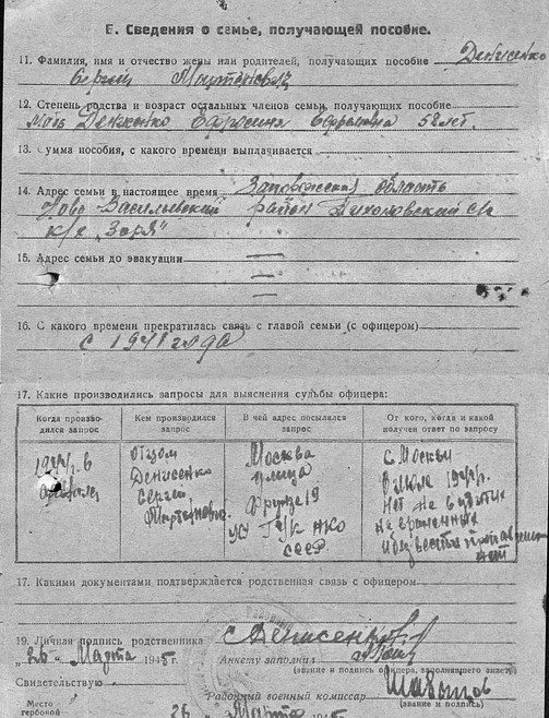 Валерий Попов: 124 авиаполк - с 1939 по 1941 годы, видимо срочная служба. Но 124 полк, судя по анкете, от Белостока до Москвы и Тулы продвинулся. Так наш Денисенко попал в Тулу.Татьяна Вотинцева: Я вот тоже к этому склоняюсь, но все это дело надо еще проработать. Ведь там и части в которых он или они проходили службу разные. Украинский в 787 ИАП, а Смоленский в 124-м.Только не ясно, если он родом из Смоленска, то почему во всех остальных документах либо Запорожская область, либо Днепропетровская. Если только предположить, что за место рождения выдавали место жительства до призыва, т. е. Украину. | ||||||||||||