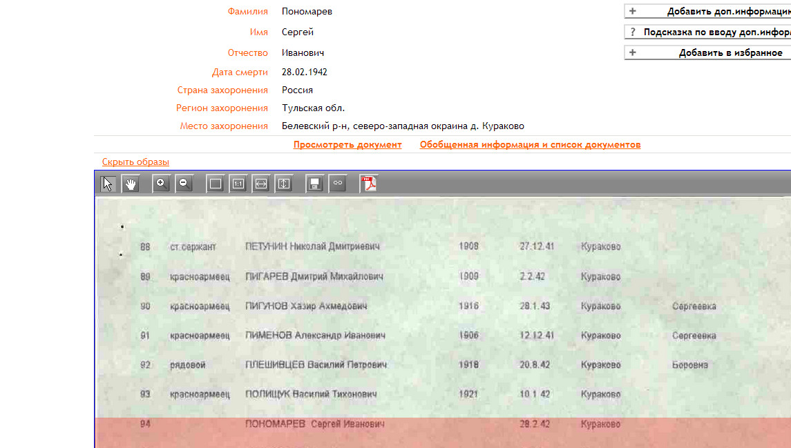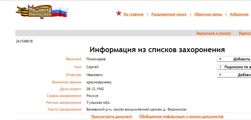 Куренков Виктор Иванович: Электронная книга памяти Тульской области ПОНОМАРЕВ Сергей Иванович, pод.: Тульская обл., Белевский р-н, д. Кураково, русский, кр-армеец, беспаpтийный, 34 СД, 28 февpаля 1942 г. погиб и зах.: Тульская обл., Белевский р-н, д. Фединское. ПОНОМАРЕВ Сергей Иванович, 34 ДИВ., 28 февpаля 1942 г. погиб и зах.: Тульская обл., Белевский р-н,c. Мишенское. ПОНОМАРЕВ Сергей Иванович, pод.: 1915 г., Тульская обл., Богородицкий р-н,Иевлевский с/с, пpизв.: Тульская обл., Богородицкий РВК, рядовой, в июле 1942 г. пропал б/в. ПОНОМАРЕВ Сергей Иванович, pод.: Тульская обл., Белевский р-н,д. Кураково, русский, кр-армеец, беспаpтийный, 28 февpаля 1942 г. погиб и зах.: Тульская обл., Белевский р-н,п. Жабынь. Получается, что под донесение ни один не попадает. Откуда же он взялся, родившийся в Мишенском, служивший в 34 Д (?) и погибший и захороненный в Жабыни? | ||||