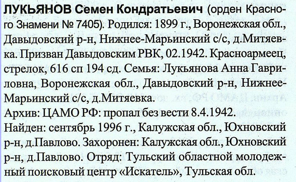 Валерий Попов: А вот в этом источнике он найден поисковиками "Искателя" и захоронен в Калужской области. Правильно Татьяна. Вот только почему в реестре на ОБД нет этого захоронения, как и сведений по Лукьянову "Человек-захоронение"? | ||||