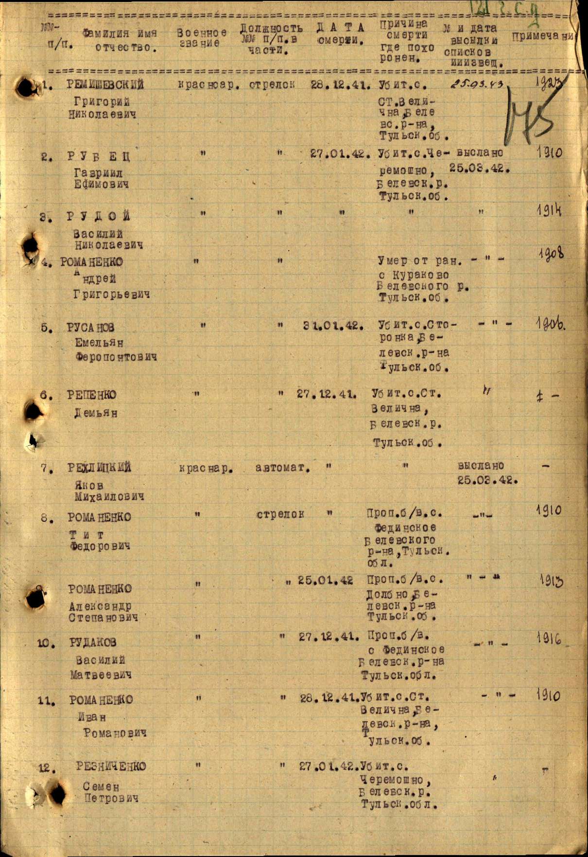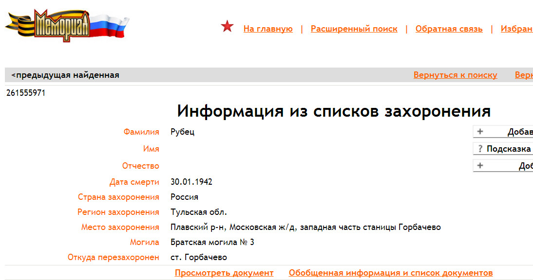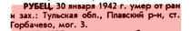 Куренков Виктор Иванович: А это еще один из электронной книги памяти Тульской области РУБЕЦ Н. М., русский, кр-армеец, пропал б/в. Виктор Иванович, а я в электронной книге памяти в общем списке захороненных в Тульской области нашла только двух Рубцов: РУБЕЦ, 30 янваpя 1942 г. умер от ран и зах.: Тульская обл., Плавский р-н, ст. Горбачево, мог. 3. Рубец Гаврил Ефимович, род.: 1910 г., Белгородская обл., Ракитянский р-н, рядовой, 1150 СП 342 СД, 27 января 1942 г. погиб и зах.: Тульская обл., Белевский р-н, д. Сторонка, перезах.: д. Долбино, южн. окр., м-36. А Рубец Н. М. находится в разделе родившихся или призванных в Тульской области. Редактировалось: 1 раз (Последний: 10 апреля 2014 в 02:03) | ||||