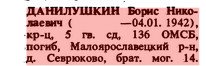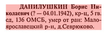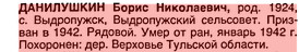 Эл. книга памяти: ДАНИЛУШКИН Борис Николаевич, род.: 1924 г., Тверская обл., Спировский р-н, Выдропужский с/с, с. Выдропужск, призв.: 1942 г., Тверская обл., Спировский РВК, рядовой, в январе 1942 г. умер от ран и зах.: Тульская обл., Дубенский р-н, Гвардейский с/с, д. Верховье, перезах.: п. Дубна, м-1. | ||||