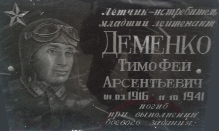 Информация из донесения о безвозвратных потерях Фамилия Деменко Имя Тимофей Отчество Арсентьевич Дата рождения/Возраст __.__.1916 Место рождения Полтавская обл., Кебылетский р-н, с/с Сухо-Маяцкий Дата и место призыва Подольский РВК, Московская обл., Подольский р-н Последнее место службы 787 ИАП Воинское звание мл. лейтенант Причина выбытия погиб Дата выбытия 11.10.1941 Погиб на месте при аварийном падение самолета в лесу 1 км от аэродрома Брыково | ||||