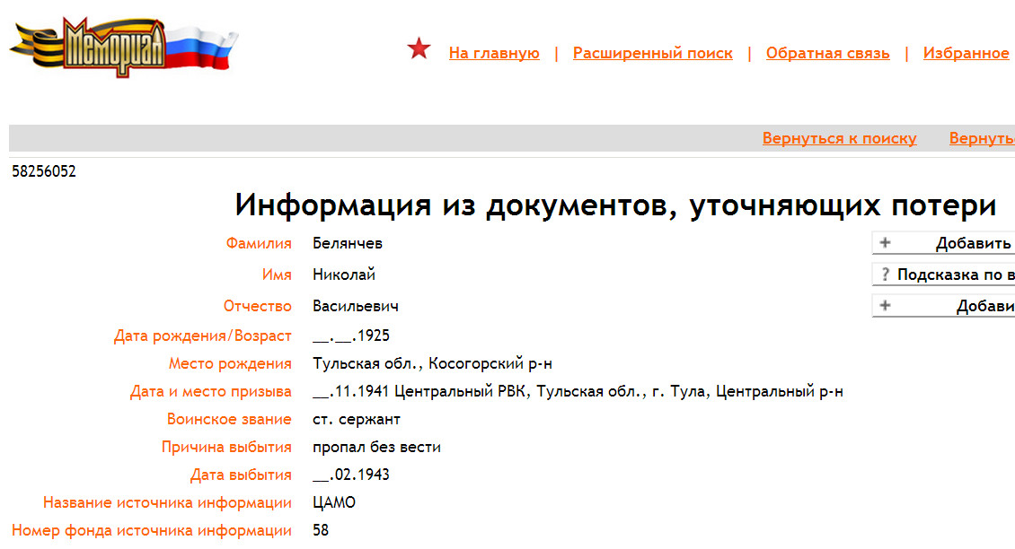 ПОИМЕННЫЙ СПИСОК ВОИНОВ, ПОГИБШИХ И ПРОПАВШИХ БЕЗ ВЕСТИ, ВНЕСЕННЫХ В ТУЛЬСКУЮ ОБЛАСТНУЮ КНИГУ ПАМЯТИ БЕЛЯНЧИКОВ Николай Васильевич, pод.: 1925 г., Тульская обл., пpизв.: г. Тула, Центральный РВК, сержант, в февpале 1943 г. пропал б/в. | ||||||||||