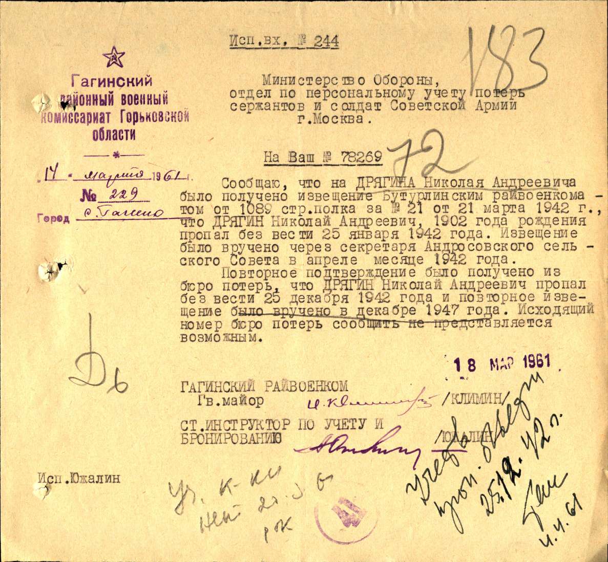 Сергей Шабров: Уважаемый Сергей! Вы прикрепили 2 лист документа, а есть ещё первый:Здравствуйте. Друзья, помогите узнать место гибели или возможное место захоронения Дрягина Михаила Андреевича 1902 г. р. Был призван Бутурлинским райвоенкоматом Горьковской области 25 августа 1941 года. Проходил службу в 322 стрелковой дивизии, 1089 стрелковый полк. Пропал без вести 25 декабря 1942 года. Не могу найти, в каких боях, где именно воевала 322 с.д. 25 декабря 1942 года. Буду признателен за любую полезную информацию. В апреле 1942 года семья получила извещение о том, что Николай Андреевич пропал без вести 25 января 1942 года. Повторное извещение вручено в декабре 1947 года. Оно пришло из бюро потерь. Вот в нем уже указано 25 декабря 1942 года. Вы прикрепили материал проверки, который выслан отделом по учету потерь минобороны в Гагинский РВК 14 февраля 1961 года. Из него следует, что были свидетельские показания односельчанина о том, что Дрягина видели несколько раз в Москве. Я так понимаю, что речь идет о послевоенном времени? Свидетельские показания принадлежали Селезневу Александру Ивановичу. Получается, что получив 2 извещения с разными датами пропажи без вести в 1961 году семья ищет Дрягина, при этом есть свидетель, который якобы видел его в Москве. Сергей, вы в запросе пишете Михаил Андреевич, а в теме - Николай Андреевич. Где правильно? Прикрепленные файлы: