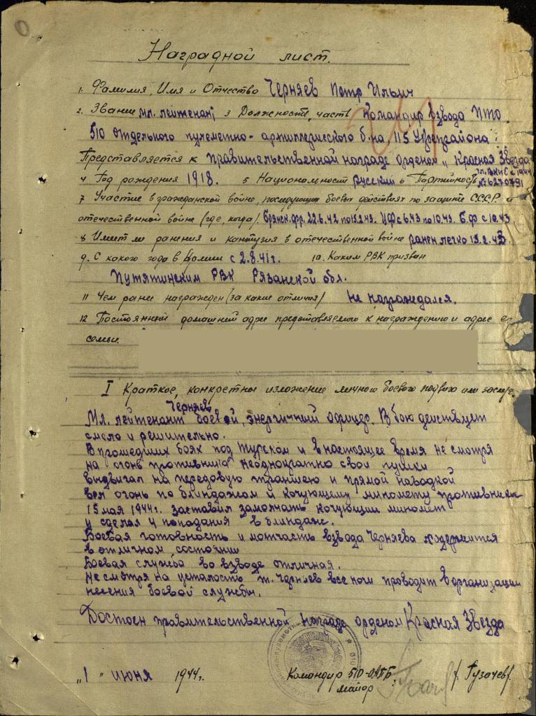 Коллеги, повторно выкладываю скан наградного листа на Черняева Петра Ильича. Это своего рода мини-боевой путь. | ||||