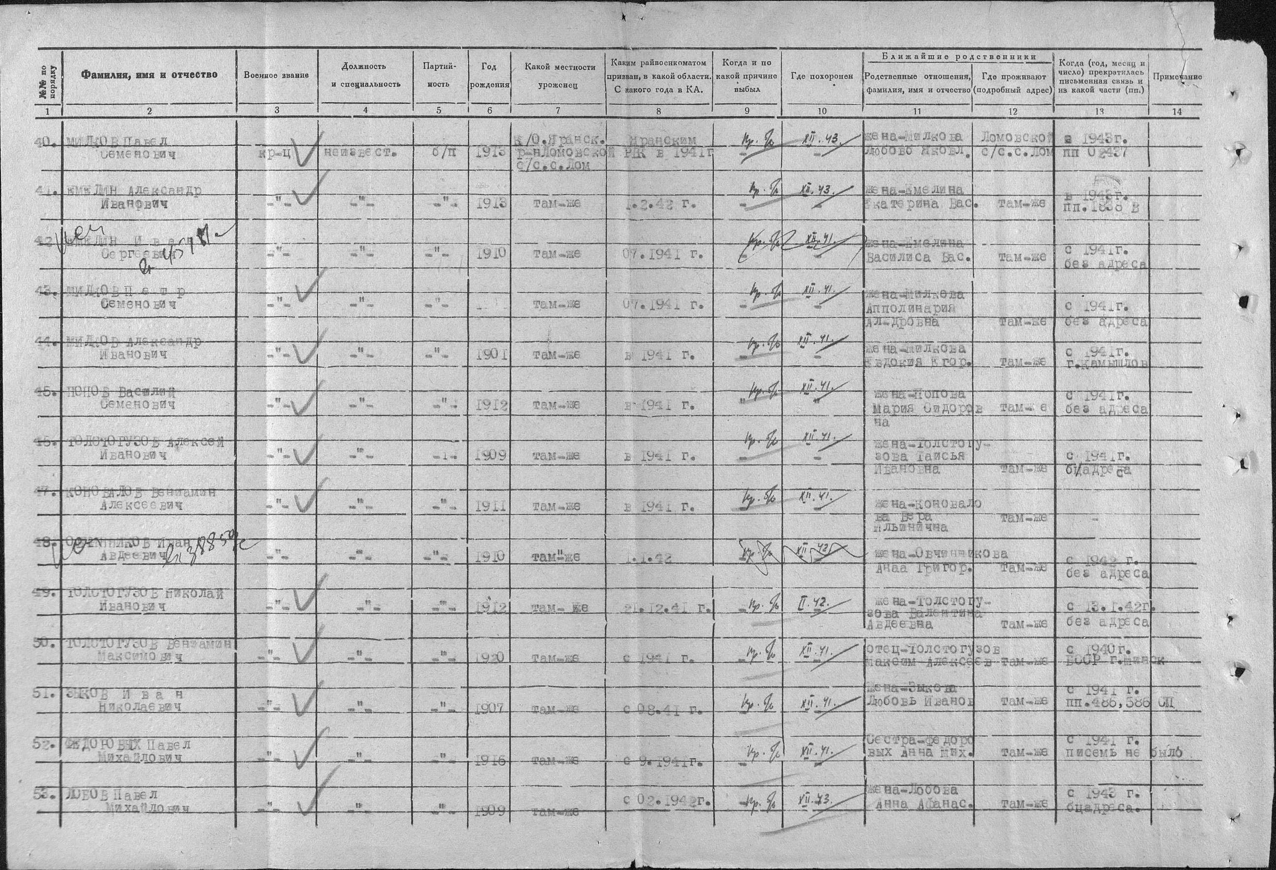 Да, это мы тоже нашли. У нас вся информация только с ОБД Мемориал. Прикреплённый документ тоже оттуда. Поисковики говорят, что это результат "подворового опроса", который проводился в 1946 году, и дата выбытия стоит условная. От деда было одно письмо, датированное сентябрём 1941 г., больше никаких вестей. В военкомате ставили "+ 3 месяца", поэтому в документе дата выбытия декабрь 1941 г. Письмо, к сожалению, не сохранилось. | ||||