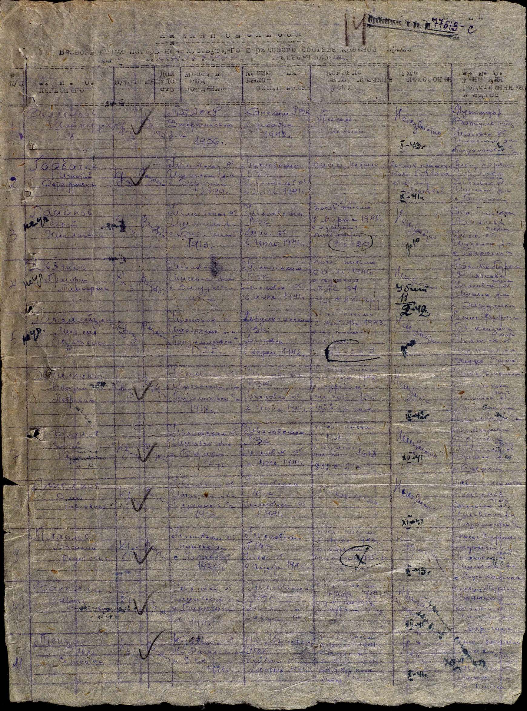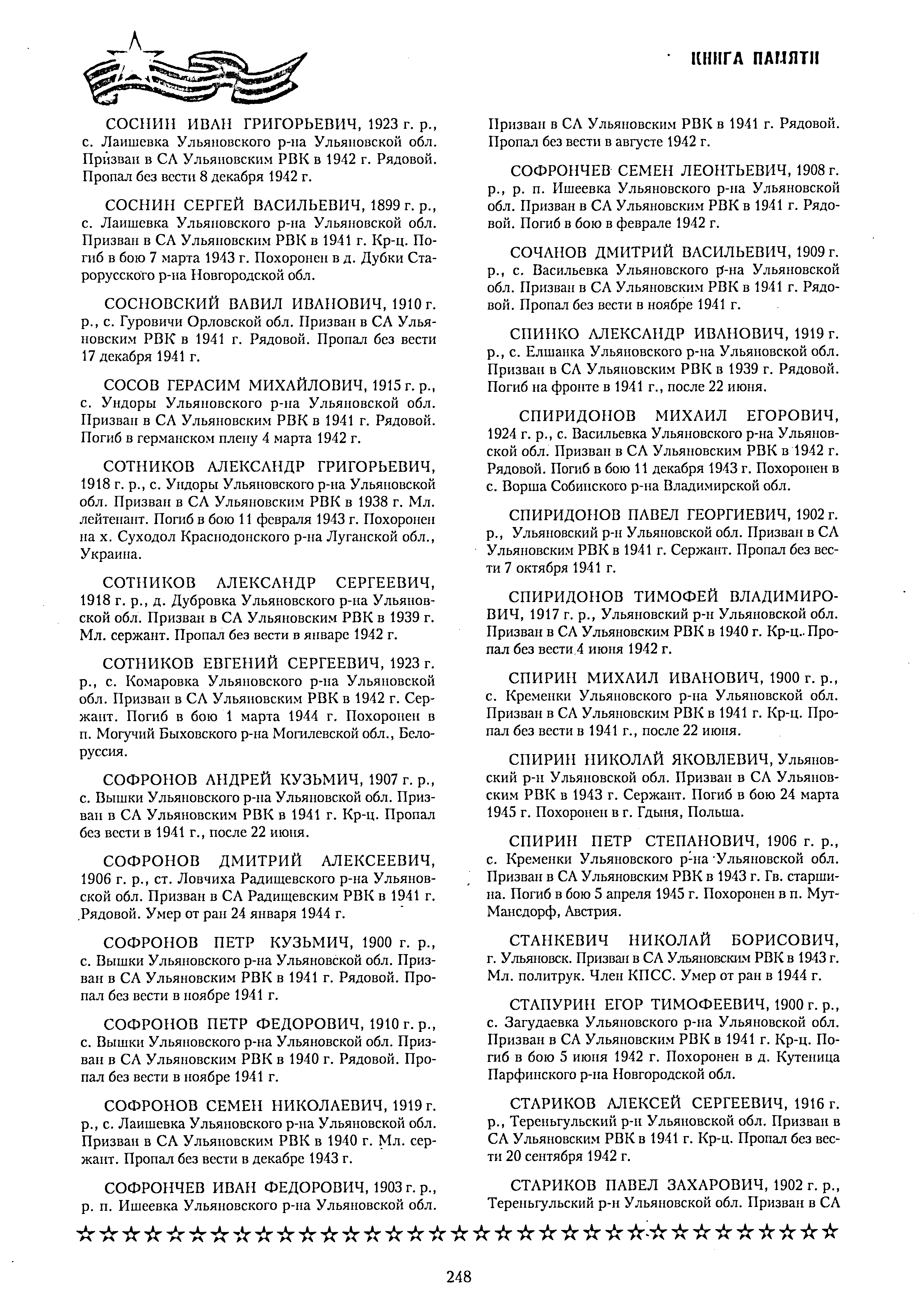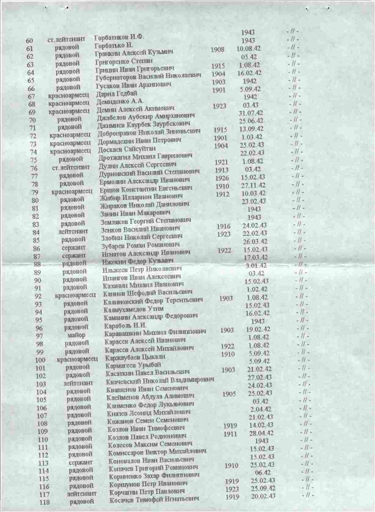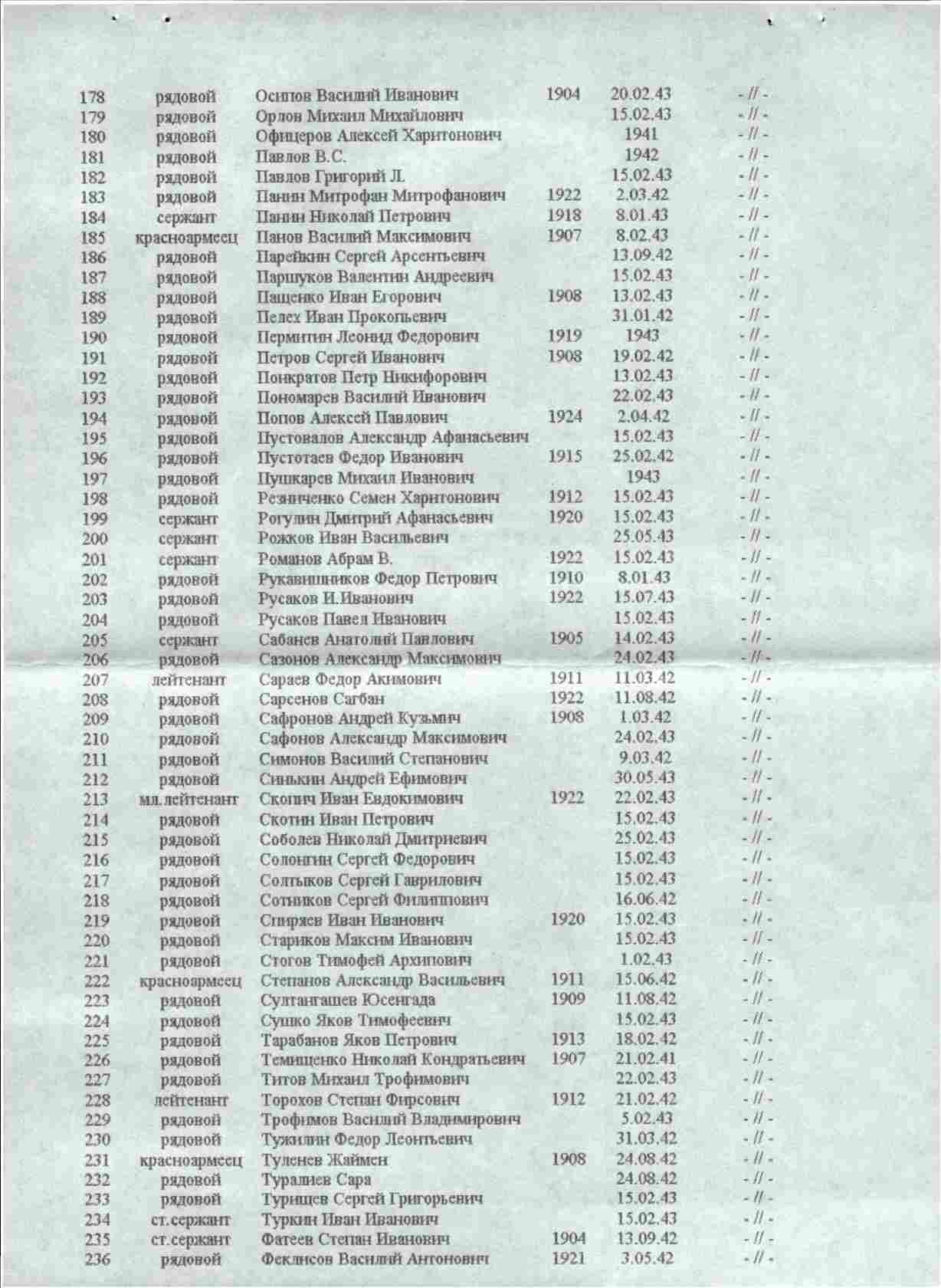ТО, ЧТО ОШИБКИ И ИСКАЖЕНИЯ ВОЗМОЖНЫ - ЭТО ОДНОЗНАЧНО. ДЕЛО В ТОМ, ЧТО КАК ПИСАРИ В ТО ВРЕМЯ, ТАК И ЛЮДИ, КОТОРЫЕ ЗАНИМАЛИСЬ ВВОДОМ ДОКУМЕНТОВ В ОБД "МЕМОРИАЛ" В НАШЕ ВРЕМЯ ОШИБАЛИСЬ, ДОПУСКАЛИ НЕТОЧНОСТИ. ОШИБОК ОЧЕНЬ ОЧЕНЬ МНОГО. ПОПЫТАЕМСЯ ВЫЯСНИТЬ В КАКОМ ЖЕ ГОДУ ОН ПОГИБ В ДЕЙСТВИТЕЛЬНОСТИ. С уважением, Валерий Попов | ||||