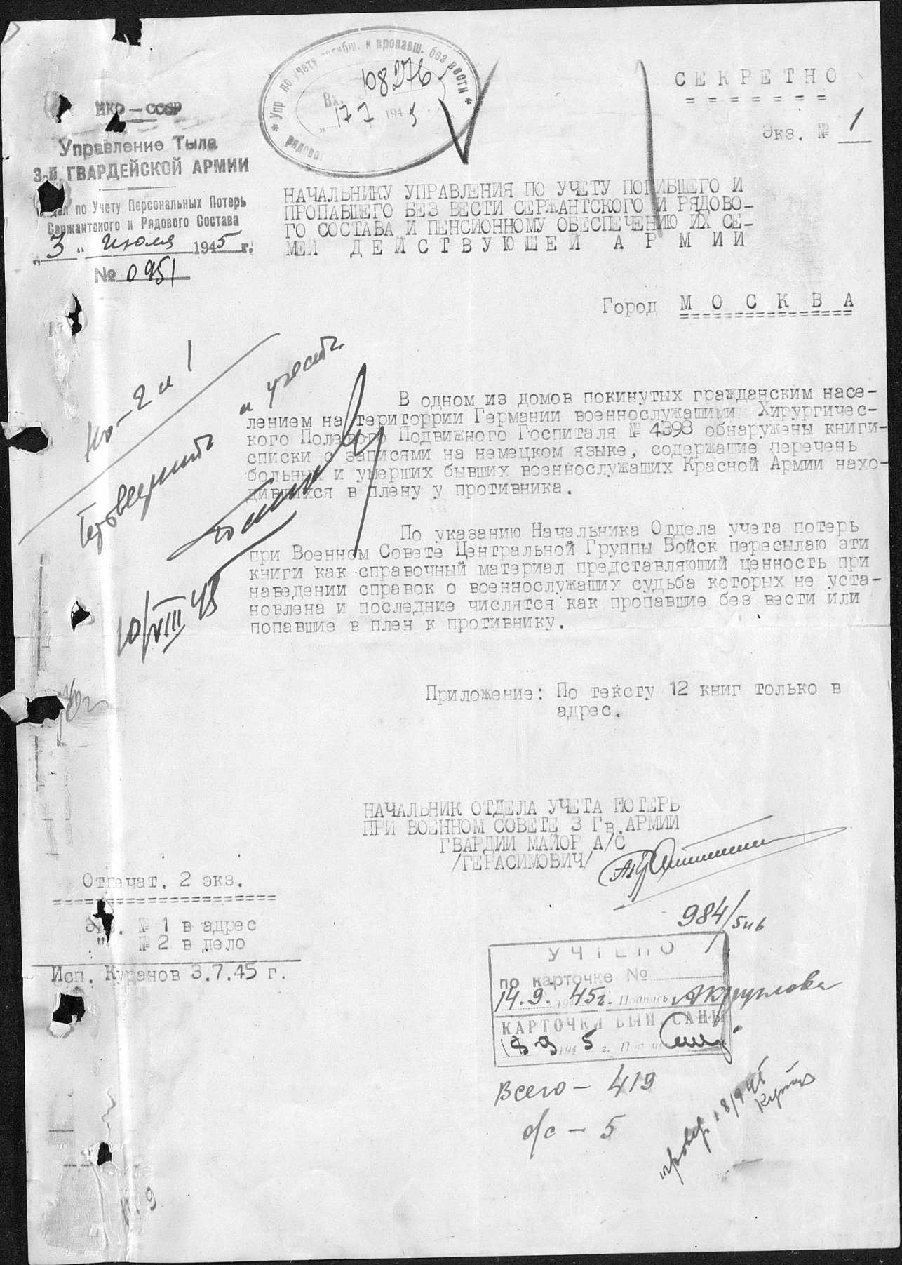 Галина, а вы заметили, что все ссылки, которые вы приводите, из одного документа? Донесения о безвозвратных потерях Номер донесения 108576 Тип донесения Донесения о военнопленных Дата донесения 17.07.1945 Название части Упр. Тыла 3 Гв. Арм. Прикрепляю его титул. |