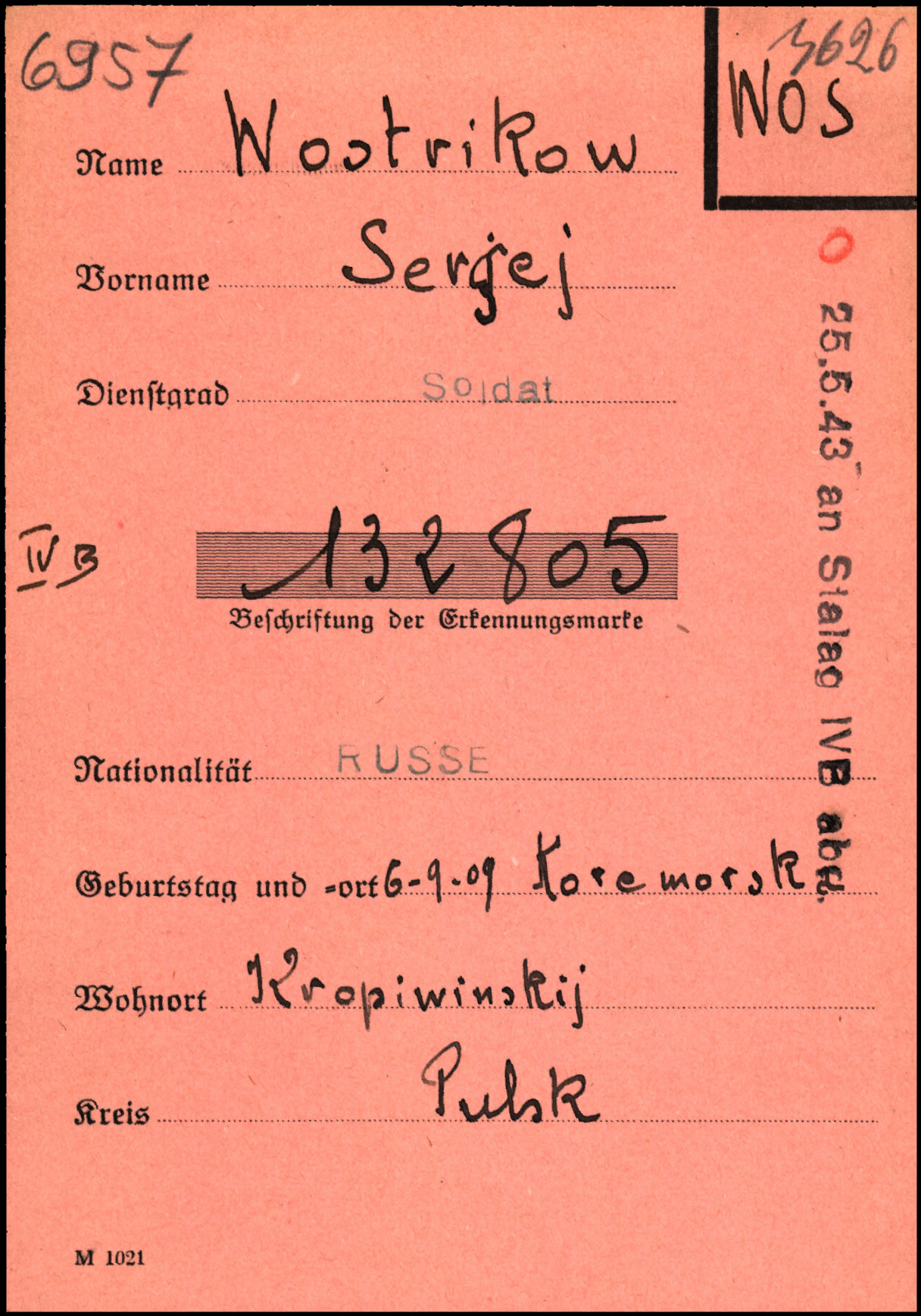83773666 Информация о военнопленном Фамилия Востриков Имя Сергей Отчество Дата рождения/Возраст 06.09.1909 Место рождения Тульская обл., Крапивенский р-н, Кореновка Лагерный номер 132805 Лагерь шталаг IV B, Мюльберг; шталаг IV G, Ошац Судьба попал в плен Воинское звание рядовой Название источника информации РГВА Номер фонда источника информации 14а Картотека лагеря военнопленных г. Мюльберг, ящик 03 Прикрепленные файлы: