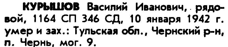 Уважаемый Леонид! Судя по всему, это действительно ваш дед. Информация из списков захоронения Фамилия Курышов Имя Василий Отчество Иванович Воинское звание рядовой Дата смерти 10.01.1942 Страна захоронения Россия Регион захоронения Тульская обл. Место захоронения Чернский р-н, п. Чернь В книге памяти Тульской области по этому бойцу есть запись(скан прикреплен). Полк, дивизия и дата смерти совпадает. Значит снова исказили фамилию. Прикрепленные файлы: