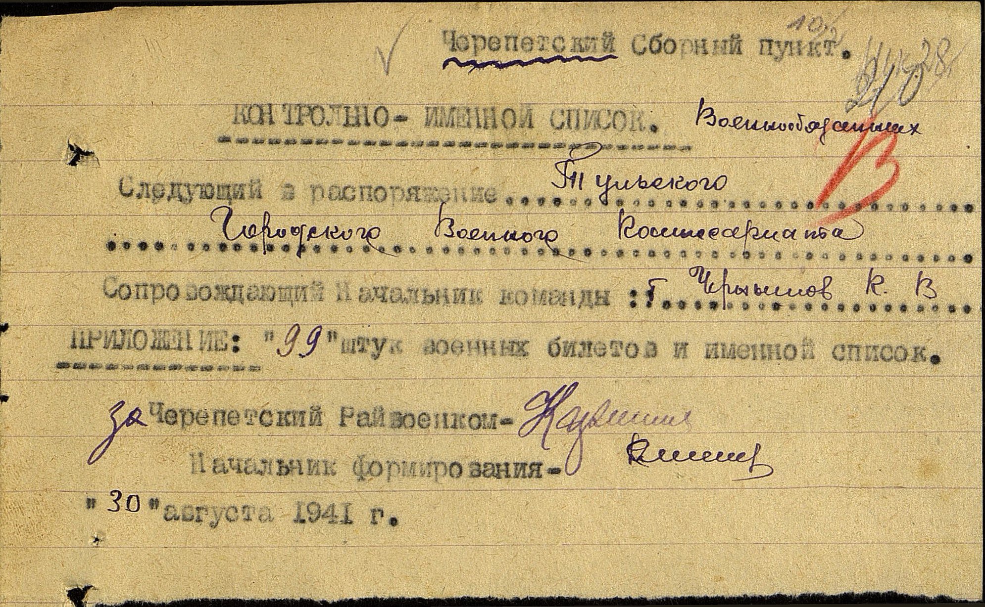 Дорогие коллеги! Заработал "Мемориал", а вместе с этим появились новые сведения по нашему бойцу (по-моему, все же именно 1 бойцу). У нас было 2 даты призывы Козлова: 12.03.1942 года ( в большинстве документов, включая донесение)и 30.08.1941 года в книге памяти Тульской области; а также 2 года рождения - 1897 и 1923. Сегодня удалось найти сведения по ВПП: Информация из документов ВПП Фамилия Козлов Имя Степан Отчество Степанович Дата рождения/Возраст __.__.1897 Дата и место призыва Черепетский РВК, Тульская обл., Черепетский р-н Воинское звание военнообязанный Название ВПП Тульский ВПП Дата прибытия 01.09.1941 Откуда прибыл Черепетский РВК Название источника информации ЦАМО Номер фонда источника информации Тульский ВПП Номер описи источника информации 612742 Номер дела источника информации 1_25 Привожу сканы титула и страницы с данными на Козлова. ВУС Степана Степановича - 134а.Это означает ограниченно годные (необученные). 30 августа 1941 года боец в составе команды убыл в Тулу, прибыл 1 сентября. 30.08.1941 г - дата призыва Козлова, погибшего 22 марта 1945 года по книге памяти Тульской области. Прикрепленные файлы:
