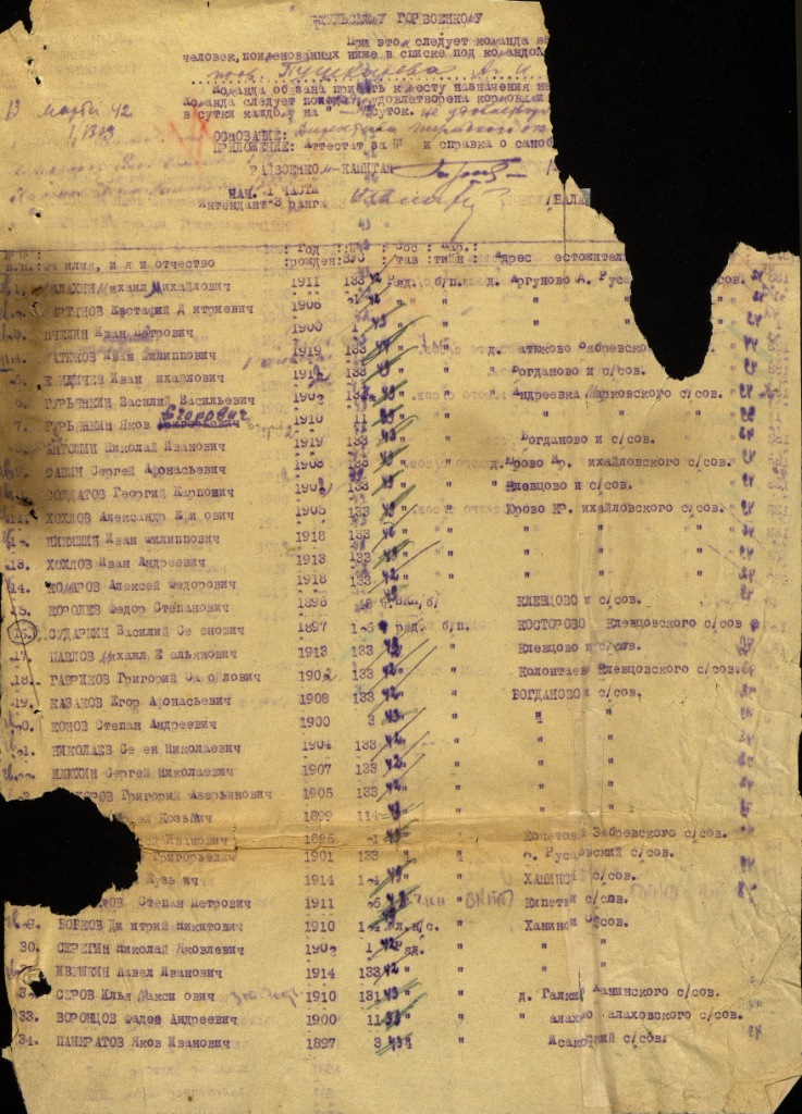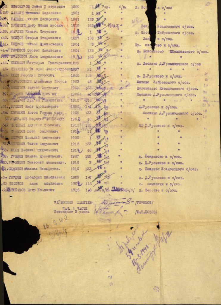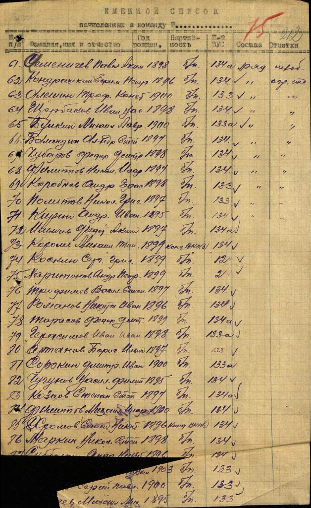Набрав в поиске Стефан Стефанович получила вот что: (титул и нужная страница) Информация из документов ВПП Фамилия Козлов Имя Стефан Отчество Стефанович Дата рождения/Возраст __.__.1897 Воинское звание рядовой Название ВПП Тульский ВПП Название источника информации ЦАМО Номер фонда источника информации Тульский ВПП Номер описи источника информации 612746 Номер дела источника информации 20 Козлов Стефан Стефанович под номером 40. Здесь его ВУС -133 (Годные необученные; Сюда относятся все годные военнообязанные, не проходившие службы в РККА (обучения) вовсе или получившие менее трехмесячной подготовки).Если учесть, что Козлов принимал участие в Гражданской войне, то к не проходившим службу его отнести нельзя, а вот прошедшим подготовку менее 3 месяцев, хоть и с большой натяжкой, но можно. Может вся загадка заключается в том, что Козлова сначала призвали в августе 1941 года, отправили на курсы, например, в Туле, а потом уже в марте 1942 призвали повторно? Недавно я сталкивалась с подобным случаем, когда после курсов человека призвали повторно из другого города, а во всех документаз место призыва указано по месту рождения.В любом случае теперь мы имеем список призывной команды от 12 (13) марта 1942 года. Там нет второго Степ(ф)а Степ(ф)ановича 1897 года. Нет сведений и по Степану Степановичу 1923 года рождения. Прикрепленные файлы: