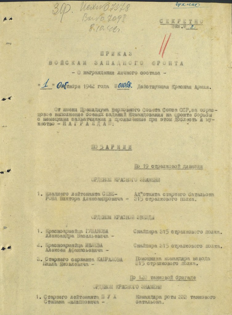 Татьяна, Валерий, я просматривала эти документы в 2013 году. И окончательно запуталась. У меня на руках справка с ЗАГСа о регистрации 21.06.1943 года в г.Донской деда с бабушкой (Струевой Анной Михайловной) в г.Донской. В Болоховский военкомат я делала запрос, там данных нет. В 1997 году я была у бабушки в г.Донской (она умерла в 1998 году), читала письма с фронта от деда, и было извещение о пропаже без вести. Бабушка берегла эти документы и после ее смерти они просто исчезли. У меня фото деда, может как-нибудь можно его загрузить