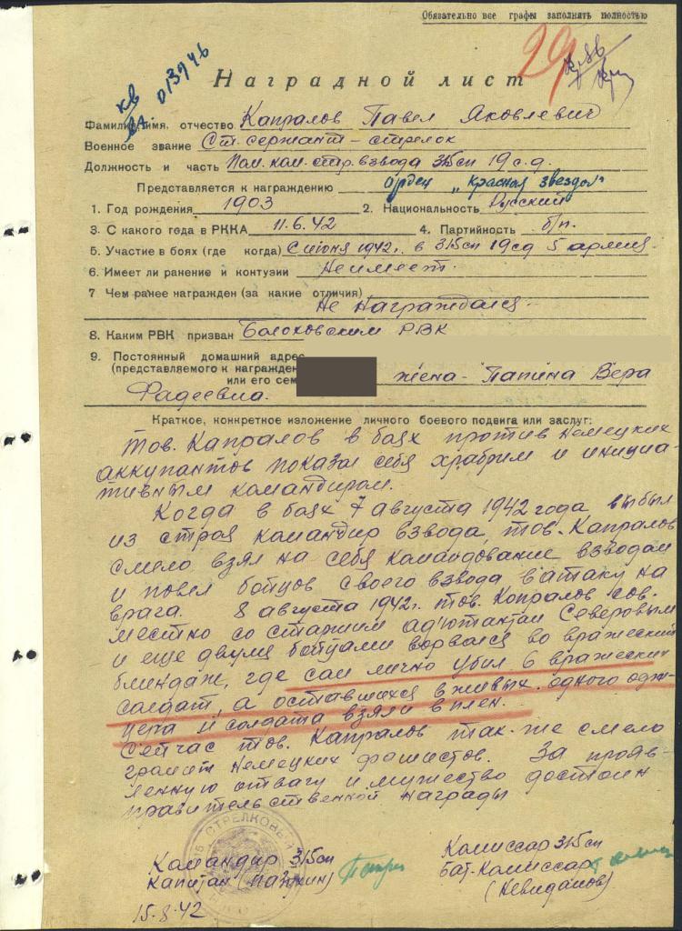 "Доброго времени суток! Пытаюсь установить судьбу своего деда. Капралов Павел Яковлевич, 1903 года рождения. Награжден орденом Красной звезды. Осталось только фото. По рассказам бабушки: дед - летчик, полк находился около поселка Руднев (Московская область), зарегистрировались 21.06.1943 года (есть справка из ЗАГСа) в г.Донской Московской области (сейчас Тульская обл.). Видела у бабушки письма с фронта и извещение о пропаже без вести деда. Бабушка умерла, все документы потеряны. Пыталась делать запросы в архив Минобороны (г.Подольск), сейчас такой информации Минобороны не выдает, мотивируя ссылкой на сайты с документами. Если есть возможность, то помогите, пожалуйста, установить хотя бы в какой части он воевал. Очень хочется детям передать историю, чтобы знали и помнили".