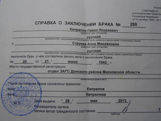 Вот справка о том, что Капралов П. Я. заключил брак с бабушкой Ирины. Прикрепленные файлы:
