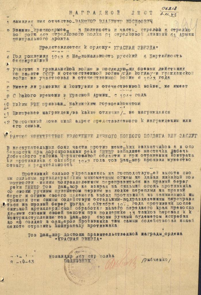 Ирина Ванциор: Татьяна Вотинцева: С другой стороны, в наградном листе не упоминаются никакие имена собственные, кроме Днепра. Потому просим вас дать ссылку на источник, где вы получили информацию. На "Мемориале" пока ничего не удалось найти по Владимиру Ивановичу. Добрый день, Татьяна! В наградном листе после "Краткого конкретного изложения... идет описание : при форсировании реки Днепр западнее местечка Любечь Любечского района Черниговской области. Да, вы правы, Роман - мой отец и брат Владимира Иосифовича. Теперь вижу. Просто "на бегу" делала. Но по вашему дяде все равно пока ничего. А на "Бессмертном полку" он в каком регионе? | ||||