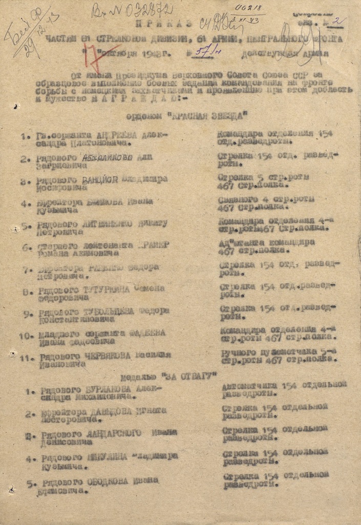 С другой стороны, в наградном листе не упоминаются никакие имена собственные, кроме Днепра. Потому просим вас дать ссылку на источник, где вы получили информацию. На "Мемориале" пока ничего не удалось найти по Владимиру Ивановичу. | ||||