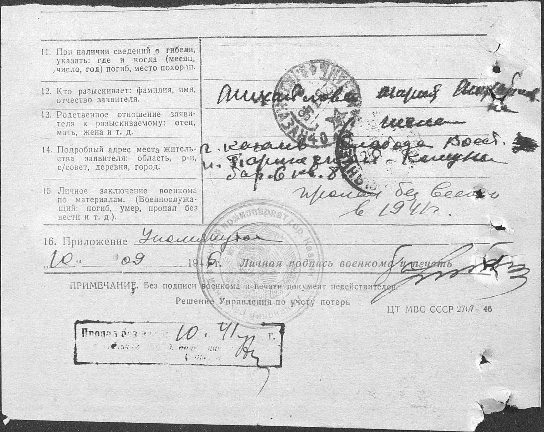 Что можно тут отметить. 1. В июле 1941 года боевых действий в Тульской области еще не велось. 2. В общем то даже если человек не воевал, то можно попытаться что то обозначить хотя бы, но нужен заявитель. Вопрос к заявителю. Он воевал или был репрессирован? 3. Если человек воевал, то ошибка в дате пропажи. Редактировалось: 1 раз (Последний: 15 апреля 2015 в 10:40) С уважением, Валерий Попов | ||