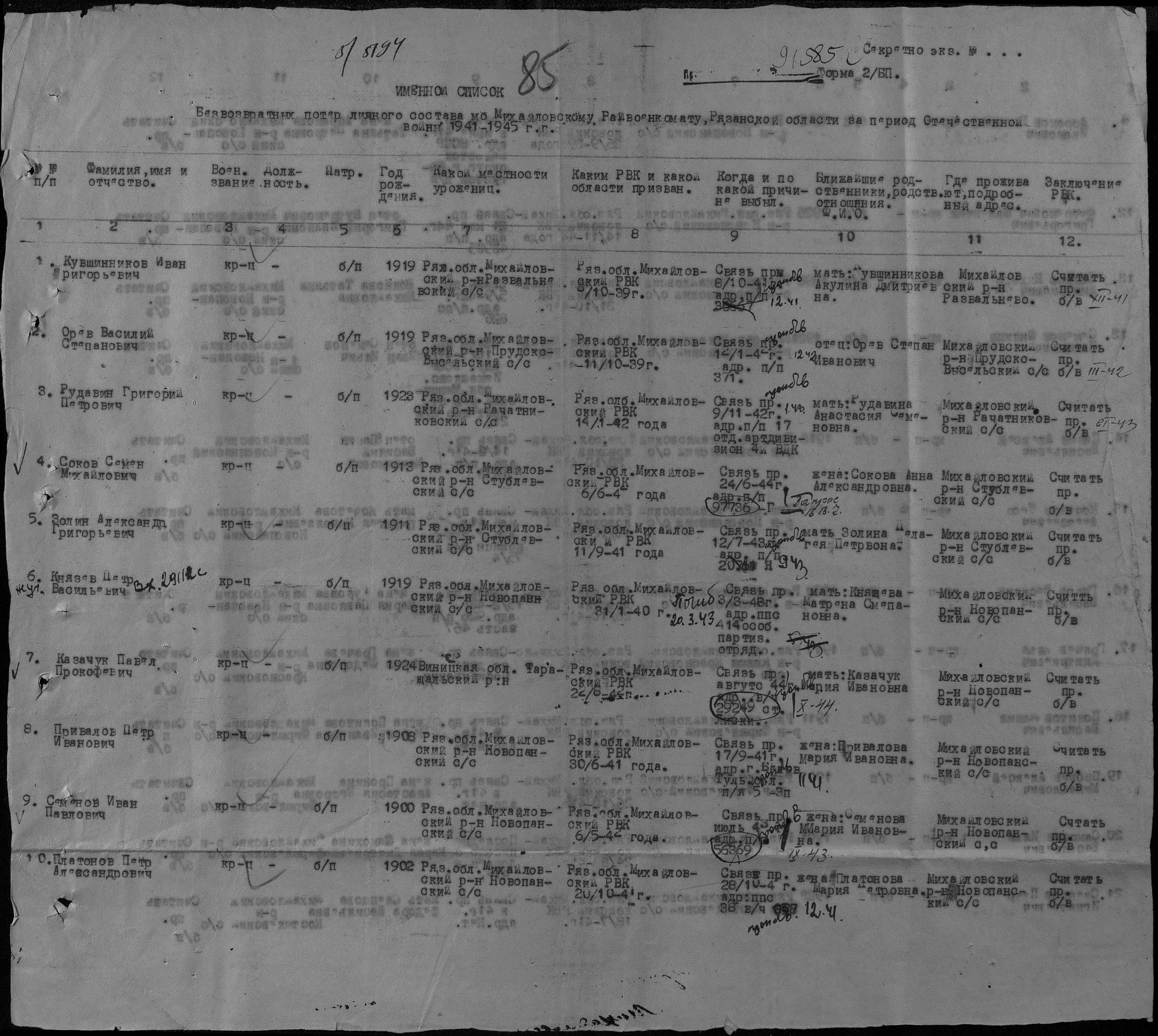 По плену. Из Казанского убыл, а в Татищевский ( Саратовская область ) ВПП прибыл Привалов Петр Иванович. Год рождения также 1908. Вопрос с местом рождения/ жительства. Там указан населенный пункт село Мусолово, Шелуховского района, Рязанской области. Как это дело у Вас соотносится. И да...В Военно Пересыльных пунктах были люди из плена. Прикрепленные файлы: