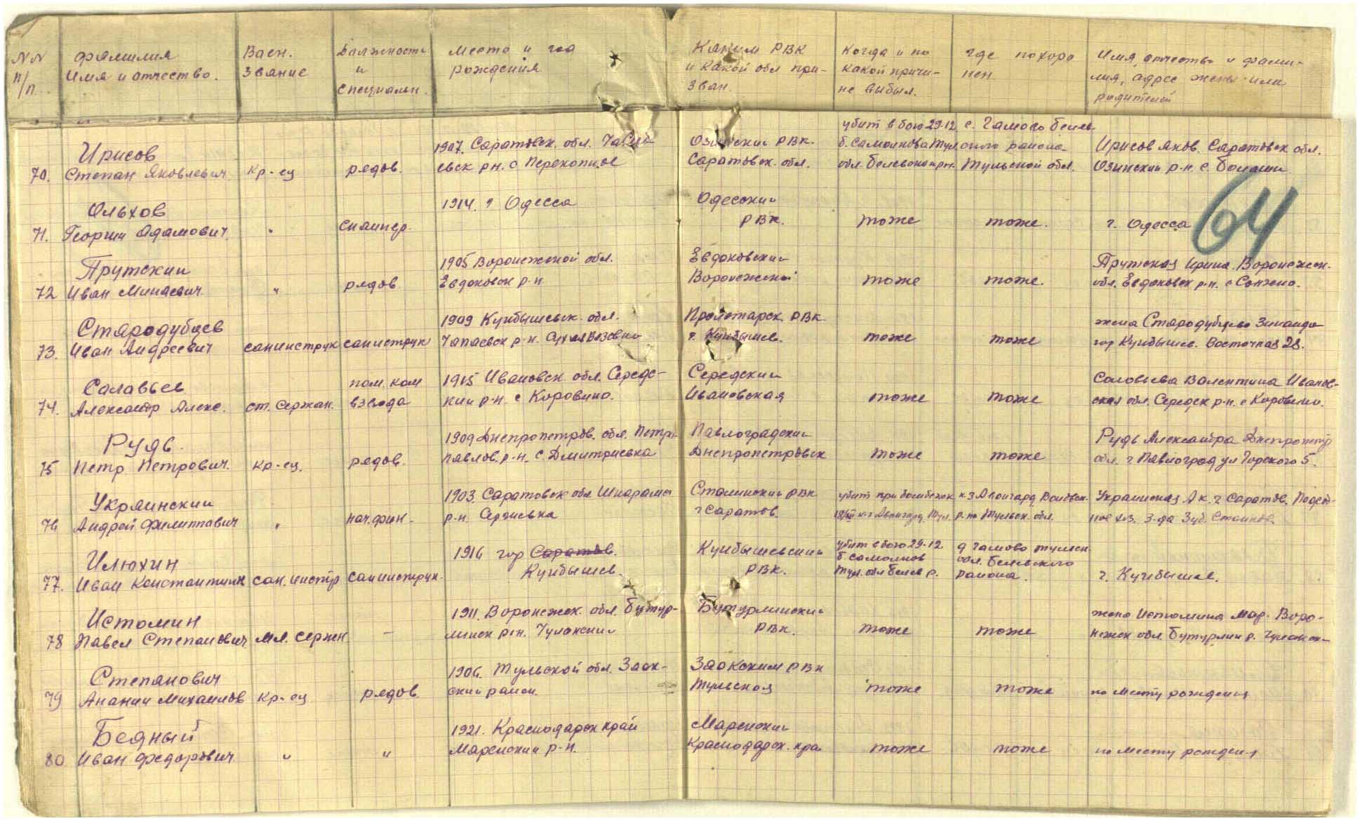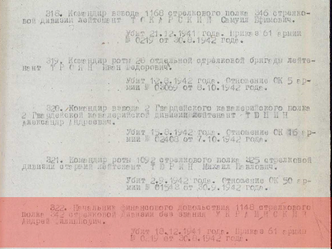 на Украинского А.Ф. есть ещё два документа. информация из донесения о потерях Фамилия Украинский Имя Андрей Отчество Филиппович Последнее место службы Западный фр. 1148 СП 342 СД Воинское звание б/з Причина выбытия убит Дата выбытия 18.12.1941 Название источника информации ЦАМО Фамилия Украинский Имя Андрей Отчество Филиппович Последнее место службы 121 Гв. СД Воинское звание красноармеец Причина выбытия пропал без вести Дата выбытия 18.12.1941 Название источника информации ЦАМО в двух книгах памяти Саратовской области указано 18.12.41, а 1942 и капитан скорее всего опечатка кр-ц и к-н , если криво написать то будет похоже. и увековечен в Гамово заодно со всеми, взяли списком и увековечили, а все документы указывают на Волово. Редактировалось: 1 раз (Последний: 26 апреля 2015 в 22:44) | ||||