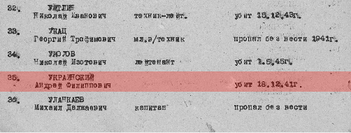 Был призван в ряды СА Сталинским РК г.Саратова.В извещении Народного комиссариата Обороны Союза СССР от 25.12.1941г. за №295 г. Мокрое сообщалось следующее: Начфин 1148сп, 342сд.В извещении Народного комиссариата Обороны Союза СССР от 25.12.1941г. за №295 г. Мокрое сообщалось следующее: Начфин 1148сп, 342сд,рядовой Украинский Андрей Филиппович, в марте 1941г. при бомбежке эшелона был ранен и умер от ран. Похоронен на могилах колхоза "Авангард" Воловского района, Тульской области.