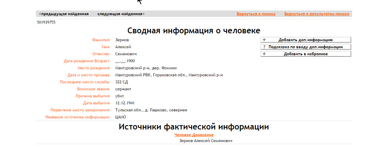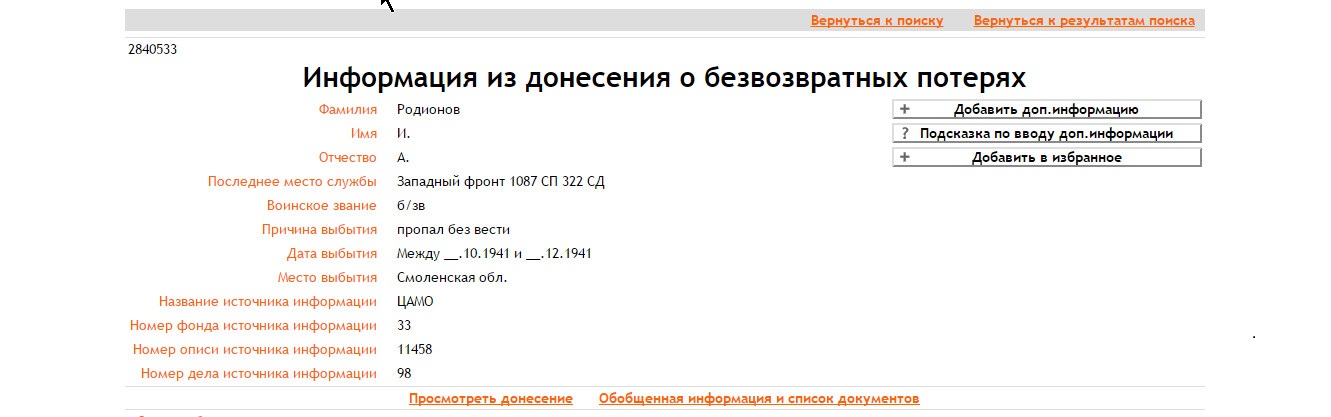 Именно список Даю ссылки. Надеюсь отобразятся. Валерий, это факт, а не мои домыслы. Я как юрист верю только фактам. Собственно это чётко видно на скриншоте архивного документа, хоть и написано от руки. Я не знаю, почему при "транскрибации" ошиблись. Я отличу рокописные буквы "И" и "Н" от "О" и "В". Убедитесь сами. Вот здесь ещё более чётко видно: http://www.obd-memorial.ru/memorial/fullimage?id=1704341&id1=d5b7e0ded74bb160dc779cc51ca27c43&path=VS/001/058-0818883-0097/00000055.jpg Это уже у упомянутого мной у Прожигина А.К. Чёрным по-белому: "Куракино". Единственное, что область не указана. Наталья, да - Киреевский р-он Тульской обл. тоже вполне допускаю. В донесении - Место выбытия написано Кураково, а теле документа "д. Куракино". Причём у всех бойцов, кто пропал без вести в период с 13 по 14 декабря 1941. У некоторых так и написано: "Пропал без вести 13.14.12.41". Остальных бойцов полка, уже в январе 1942 "списали" как пропавших без вести в Кализне и Куриловке. Какая-то поразительная невнимательность при подготовке документов на obd? Я просмотрел весь 1087 СП. Сомнений быть не может. | ||||