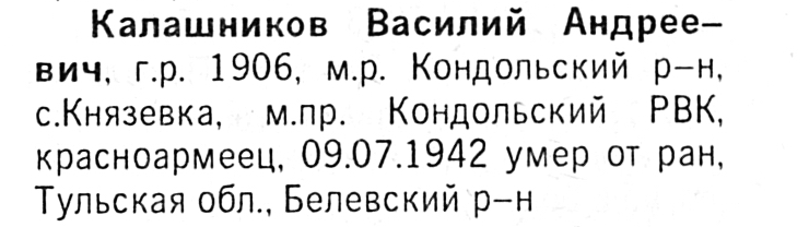 А вот тут утверждается, что Калашников Василий Андреевич, который скончался в тот же день умер в Ульяновском районе соседней Орловской области. Прикрепленные файлы: