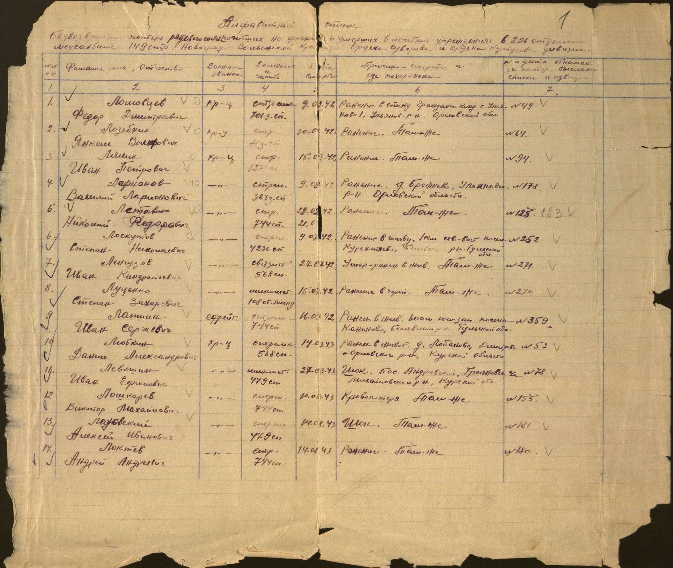 Очнева Раиса: Раиса. Этот тот лист, что я выложил в посте № 4.Информация из медицинского документа Фамилия Калашников Имя Василий Отчество Андреевич Последнее место службы 744 сп Воинское звание красноармеец Причина выбытия умер от болезни Дата выбытия 09.07.1942 Госпиталь 226 ОМСБ 149 сд Название источника информации ЦАМО Номер фонда источника информации 58 Номер описи источника информации А-71693 Номер дела источника информации 1000 http://www.obd-memorial.ru/html/info.htm?id=53717415 С уважением, Валерий Попов | ||||