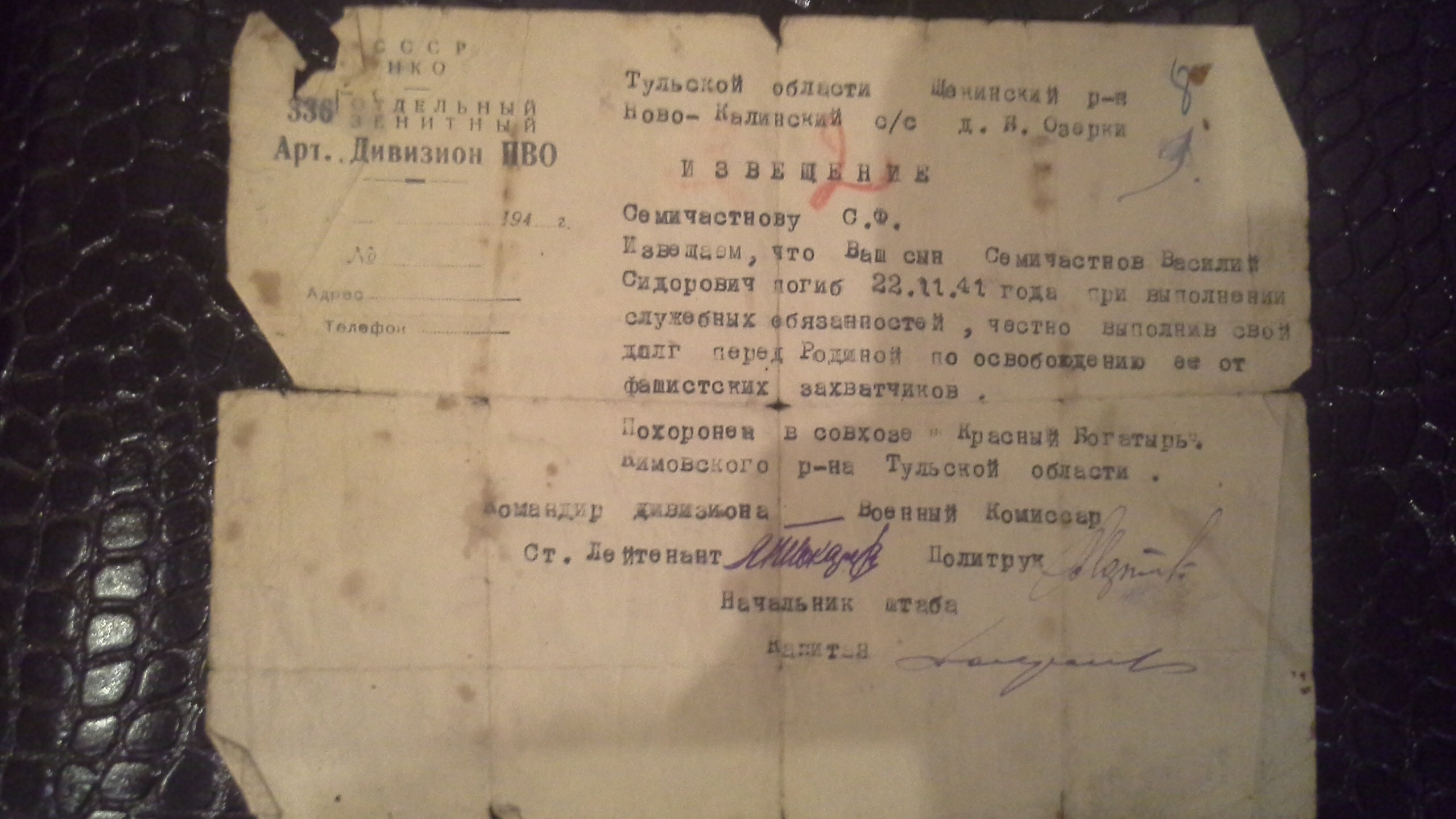 У нас появилась информация от внучки капитана Лисова, по документам ЦАМО и Лисова и Климкина приговорили к ВМН, приговор приведен в исполнение 27 ноября 1941 года. Предполагаю что батарея ст. л-та Токарева ушла на восток, вместо того чтобы войти в состав Веневского боевого участка, поэтому у него не было штабной печати и извещение на Семичастнова оказалось не оформленным. За то что комдив полностью не смог свой дивизион переподчинить 108 ТД и он потерял контроль управления над одной ( а может и двух) батареей скорее всего и был приговорен к расстрелу. Редактировалось: 2 раз (Последний: 12 января 2016 в 06:06) | ||||||||